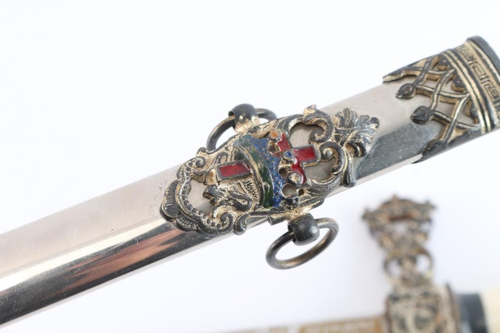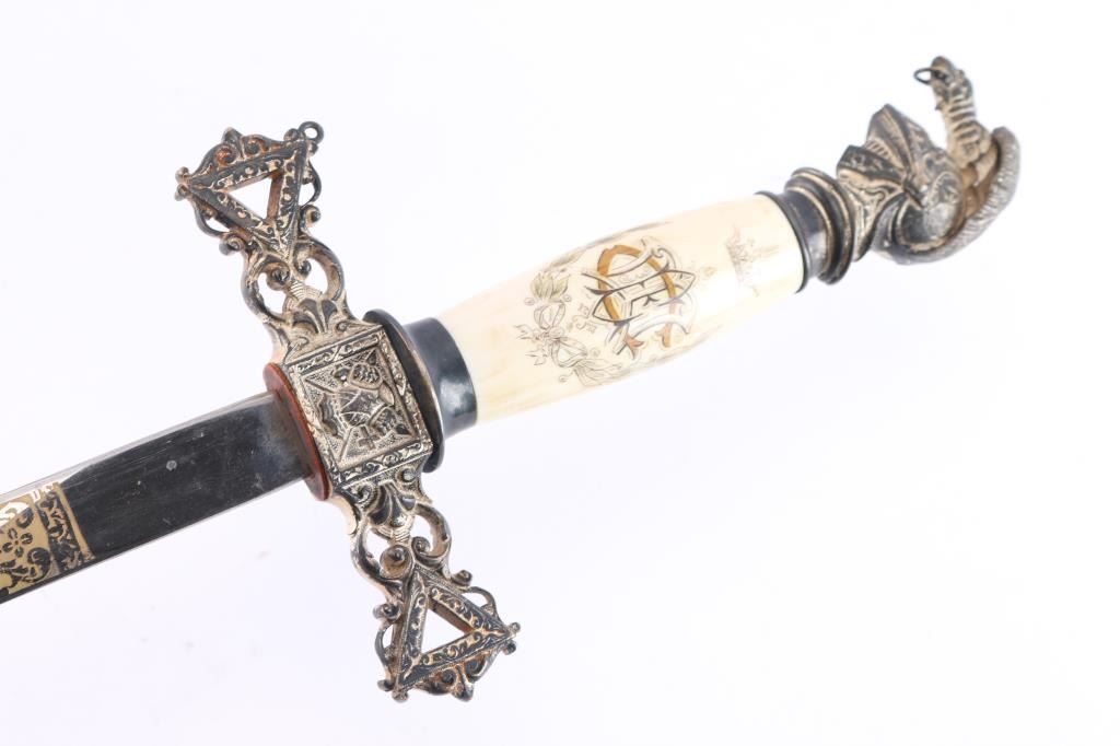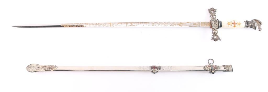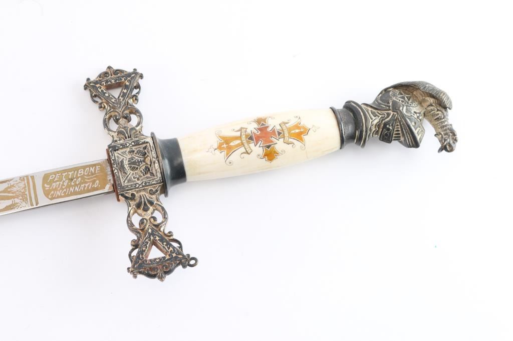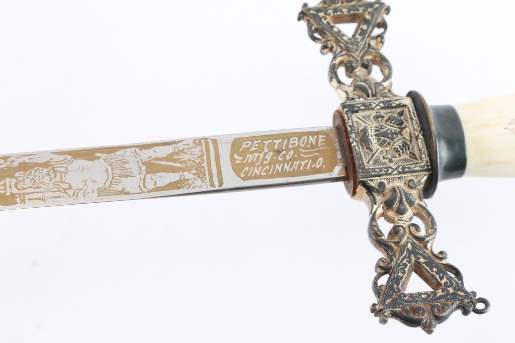 With knightly motifs. By Pettibone Mfg. Co., Cincinatti, Ohio, about the turn of the century. Fancy etched and gold plated blade inscribed M.K. Copeland. Blade is fine to excellent and sword is very good plus overall. Enamel and etching on scabbard and mystic bird on pommel. A bit better than average quality and quantity of decoration.