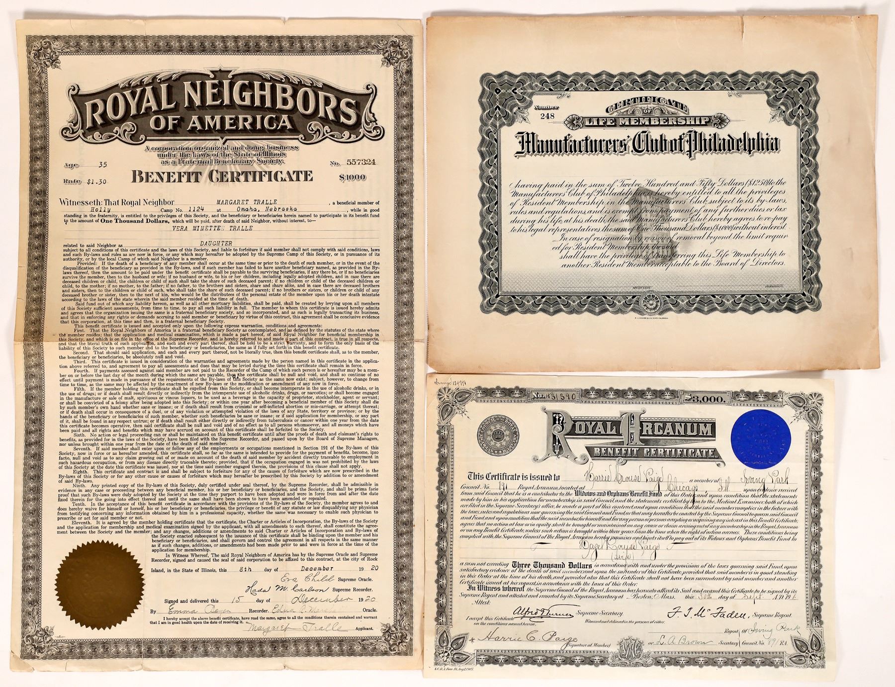 3 vintage membership and benefit certificates. Unissued Manufacturers Club of Philadelphia. 1920 Royal Neighbors of America. 1911 Royal Arcanum.