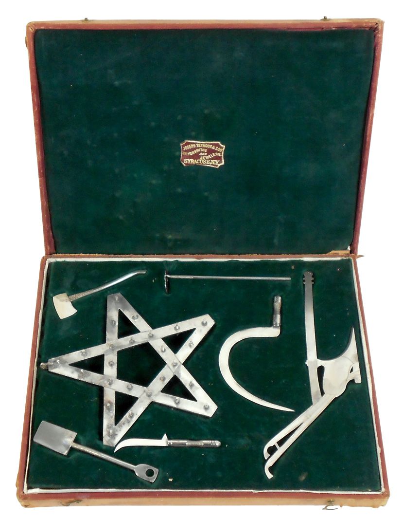 Fraternal Patrons of Husbandry (National Grange) implement case, contains emblems of the first 4 degrees; ax, plow, harrow, spade, hoe, pruning knife & sickle, symbols for key lessons for new members, mfgd by Joseph Seymour-Silversmith & Jeweler-Syracuse, NY, c.1870-1879, fitted velvet-lined case, interior & contents in Exc cond, loose lid, 1"H x 9.5"W x 8"D.