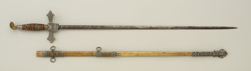 Fraternal or Lodge sword marked E.K.G. at center of scabbard; knightly motifs; eagle pommel; good overall condition; wrap deteriorating on grip; circa 1870’s-1890’s; marked “Horstmann”. Est.: $200-$400.