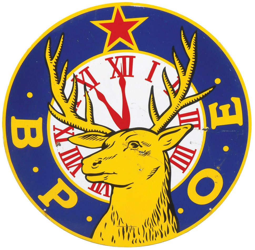 Fraternal sign, B.P.O.E., porcelain, Elk in center w/clock striking 11 o'clock, VG cond w/minor loss, 30"Dia.
