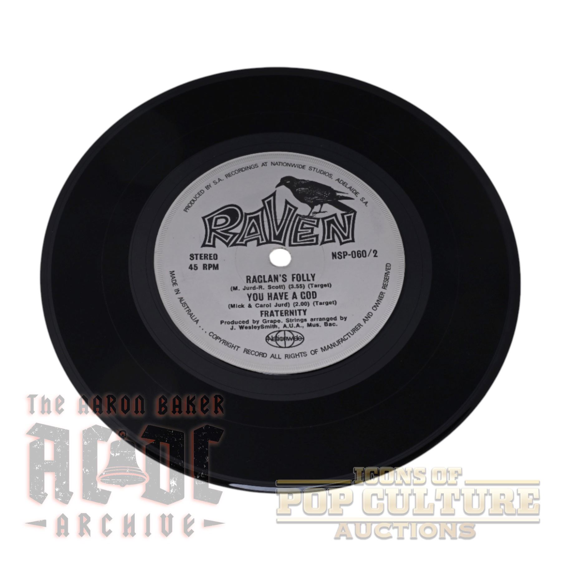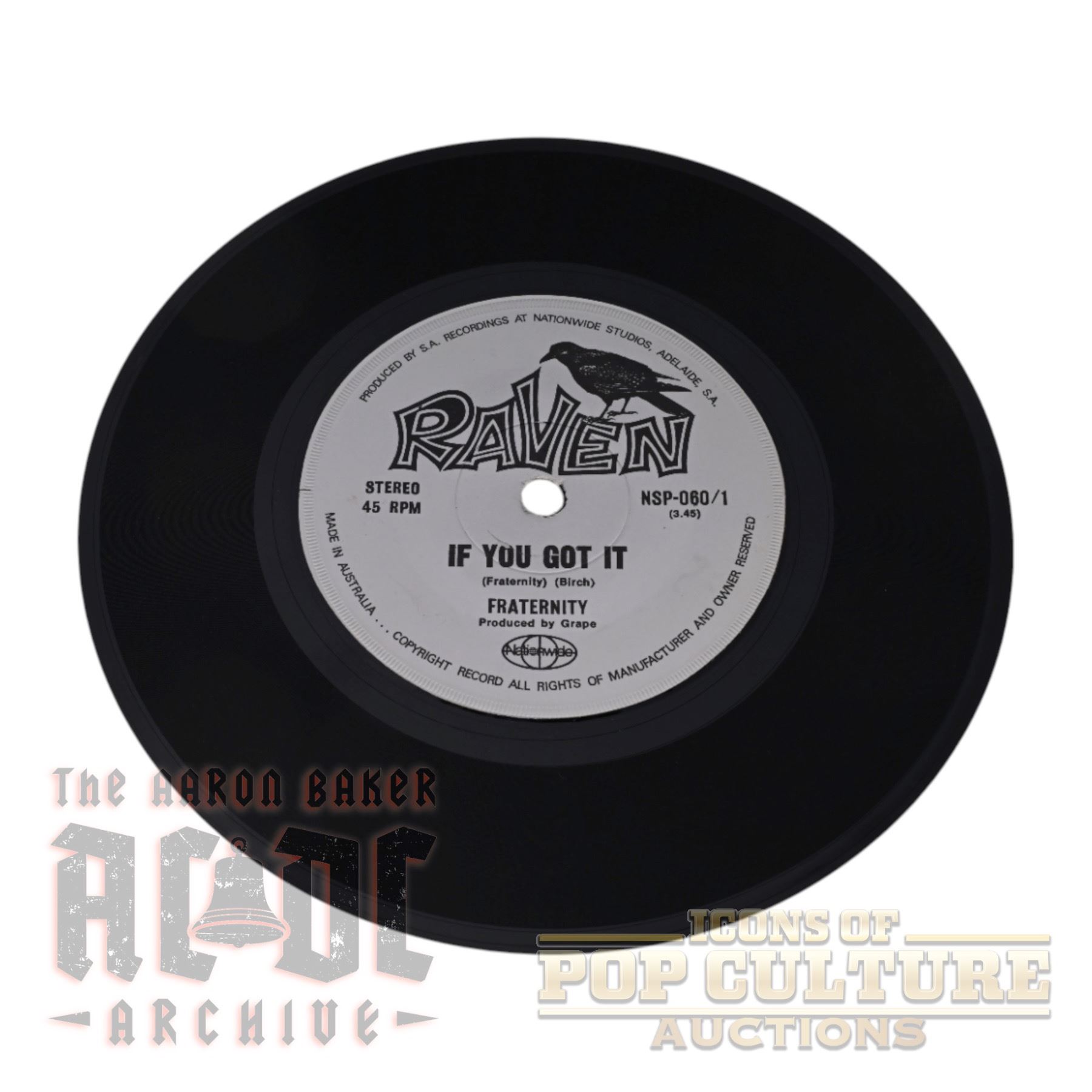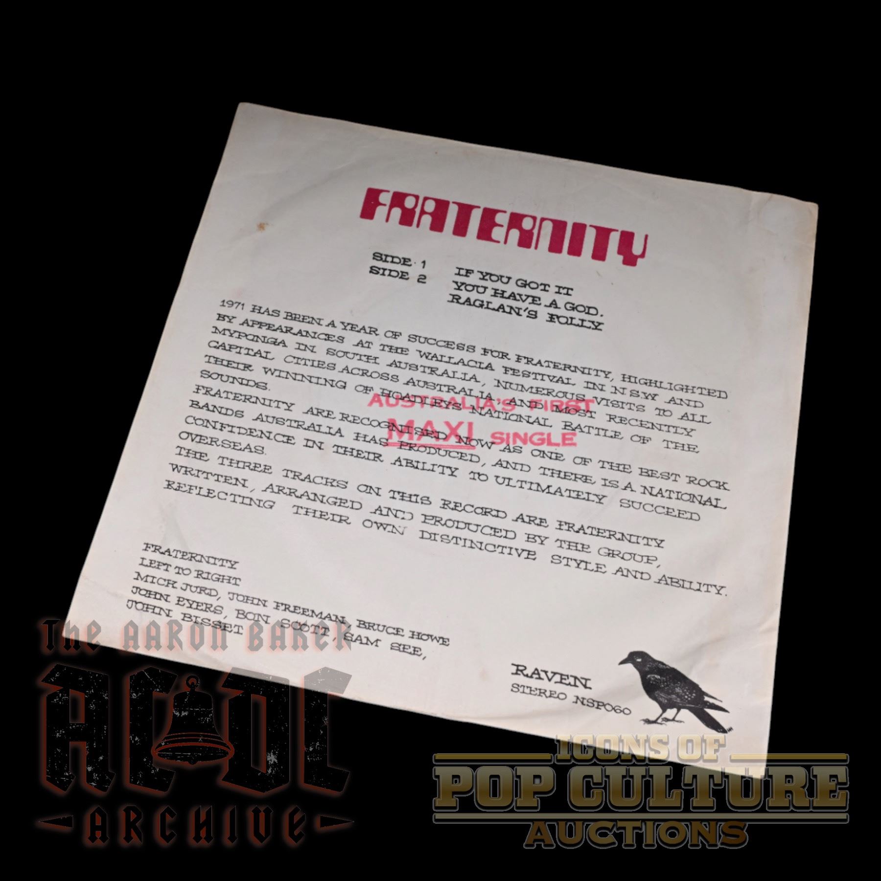 a 1971 Australian 7-inch single by Fraternity, released on the Raven label under catalog number NSP-060/1. Side 1 features “If You Got It” (written by Birch), while Side 2 includes “Raglan’s Folly” (written by M. Jurd and R. Scott) and “You Have A God” credited to Mick & Carol Jurd. The record was produced at Nationwide Studios, Adelaide, South Australia, by Grape. The sleeve highlights the band’s growing success at the time, with a lineup that included Bon Scott. Bon would later rise to worldwide fame as the lead singer of AC/DC, co-writing and performing on legendary tracks such as “Let There Be Rock” and “Highway To Hell,” cementing his place as one of rock’s greatest frontmen.