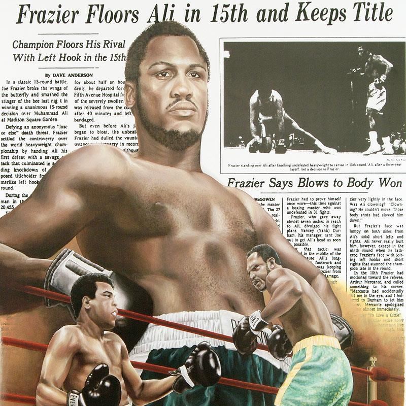 "Frazier Floors Ali" is a fine art lithograph poster on paper of the "Fight of the Century" between heavyweight champs Joe Frazier and Muhammad Ali. Measures approx. 26.5" x 36.5" (with border), 23" x 33" (image).