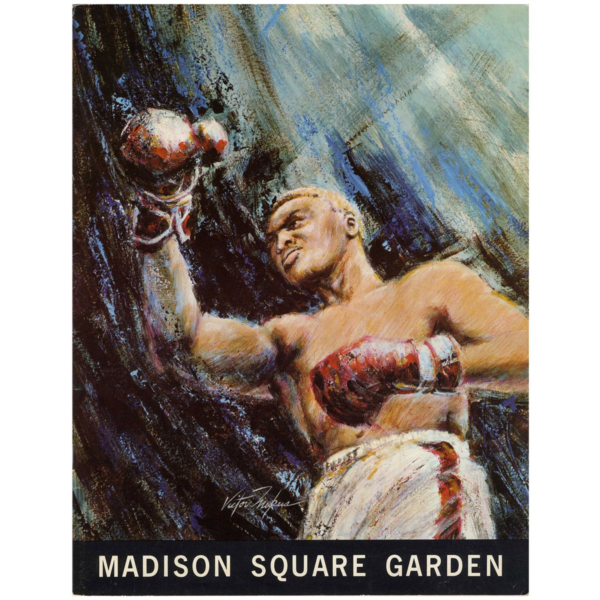 Extremely nice, rare official on-site program for the World Heavyweight Boxing Championship fight between Joe Frazier and Jerry Quarry at Madison Square Garden on 23 June 1969. In this fight for the NYSAC heavyweight title, Frazier beat Quarry in a 7th round TKO after referee Arthur Mercante dramatically stopped the fight because of cuts to Quarry's eye. It was Ring Magazine's 1969 Fight of the Year. Measures 8.5'' x 11''. 52pp. program is clean and unmarked, in near fine condition.