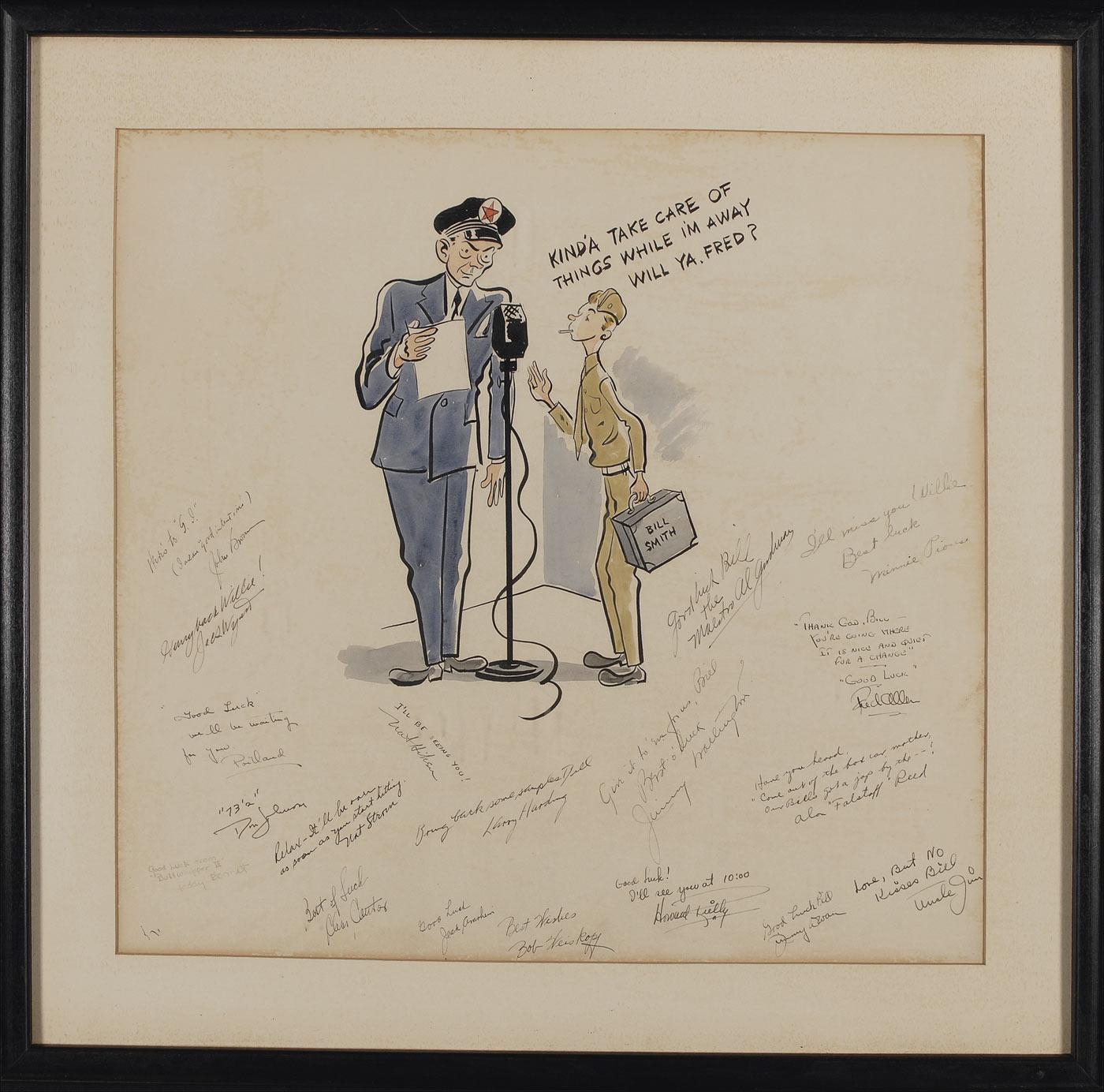 Original vintage ink and watercolor presentation sketch, 19.5 x 17.5, done in an unknown artist’s hand depicting Fred Allen and show cast member Bill Smith, with Smith preparing to leave the show to go into military service in World War II, with Smith saying to Allen, “Kinda take care of things while I’m away will ya Fred?,” and signed underneath by 19 cast and crew members including Allen, who added, “Thank God, Bill—You’re going there it is nice and quiet for a change,” and also signed by Portland, Alan Reed, and Maestro Al Goodman. Matted and framed to an overall size of 25 x 23.25. In fine condition, with scattered light toning and foxing to sketch and mat. Oversized.