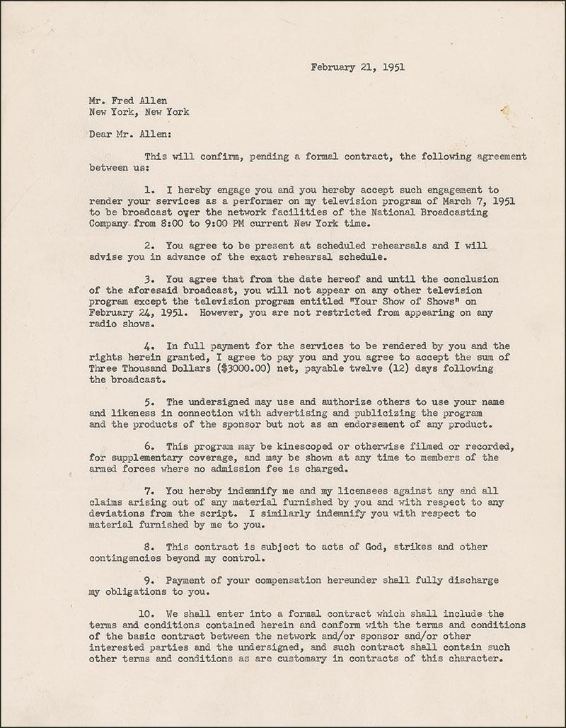 DS, two pages, 8.5 x 11, February 21, 1951. Letter of acceptance by Allen to appear on comedian Ed Wynn’s NBC program, Four Star Review in exchange for $3,000. In part: “I hereby engage you and you hereby accept such engagement to render your services as a performer on my television program of March 7, 1951…We shall enter into a formal contract which shall include the terms and conditions contained herein and conform with the terms and conditions of the basic contract between and/or sponsor.” Signed at the conclusion in blue fountain pen, “Fred Allen,” and in black fountain pen, “Ed Wynn.” In very good condition, with corner creasing, trivial soiling, and staple holes at upper left corner. Pre-certified PSA/DNA and RRAuction COA.