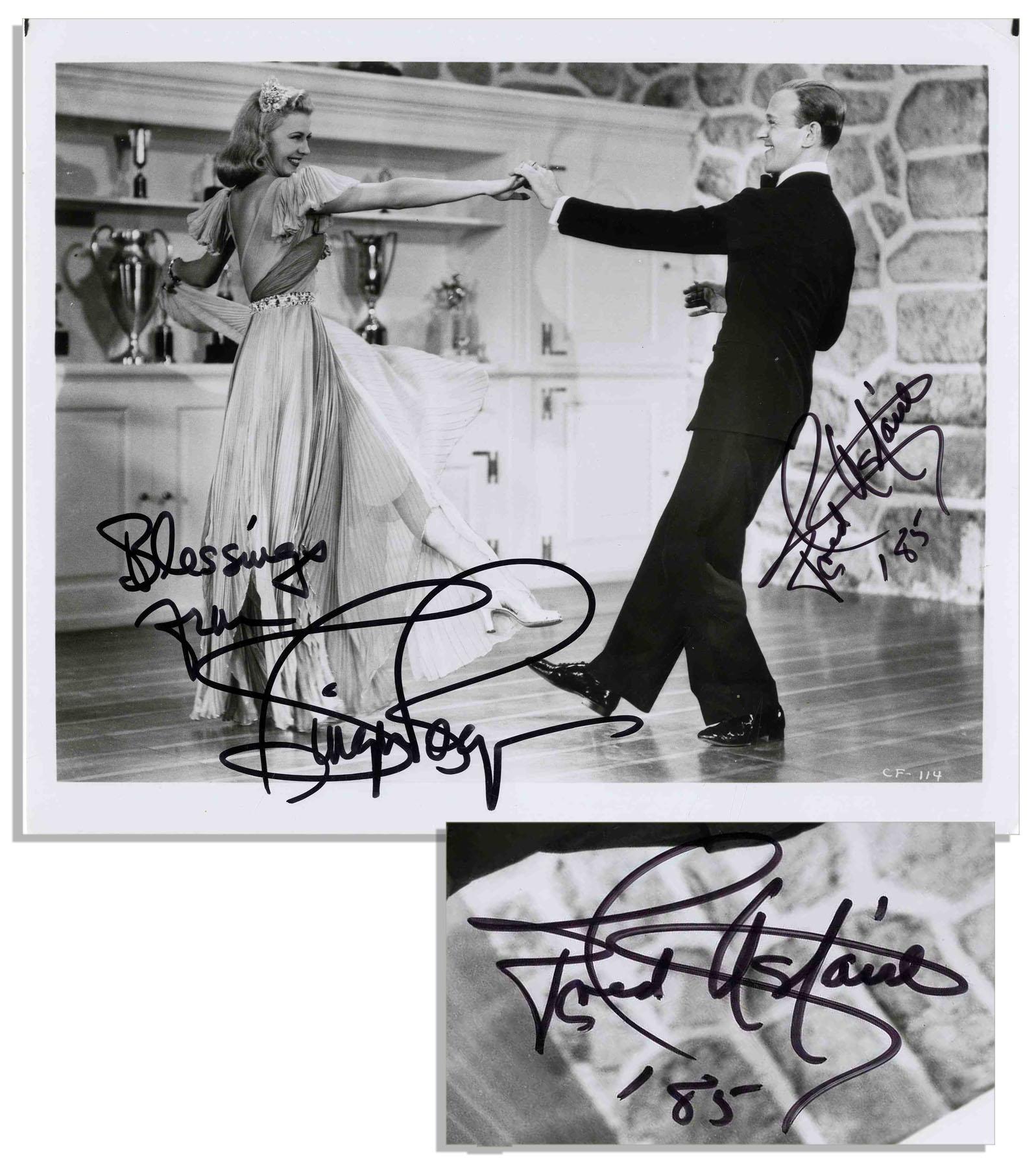 Famed dancing duo Fred Astaire and Ginger Rogers signed 10'' x 8'' glossy photo from the 1938 musical ''Carefree.'' Signed boldly in black marker: ''Fred Astaire / '85'' just two years before his death, and ''Blessings from Ginger Rogers'' with Rogers' signature exceptionally large, measuring 4'' x 3''. Near fine condition.