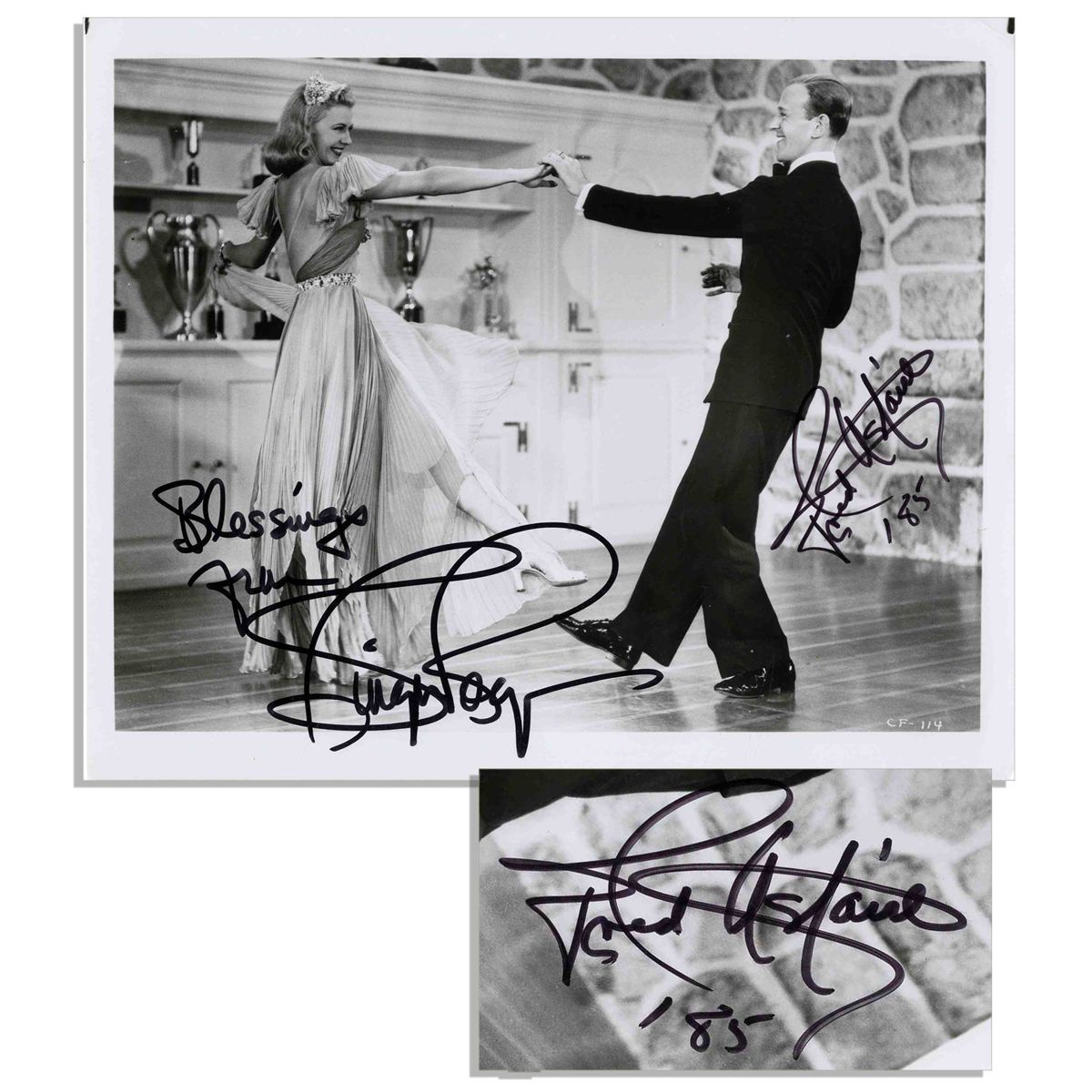 Famed dancing duo Fred Astaire and Ginger Rogers signed 10'' x 8'' glossy photo from the 1938 musical ''Carefree.'' Signed boldly in black marker: ''Fred Astaire / '85'' just two years before his death, and ''Blessings from Ginger Rogers'' with Rogers' signature exceptionally large, measuring 4'' x 3''. Near fine condition.