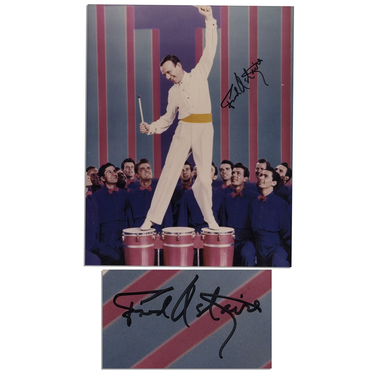 Colorful photo signed, ''Fred Astaire'' in black felt tip. The dancing star strikes a lively pose atop a trio of drums. Famous John Kobal image. Semi-matte photo measures 8'' x 10''. Fine.