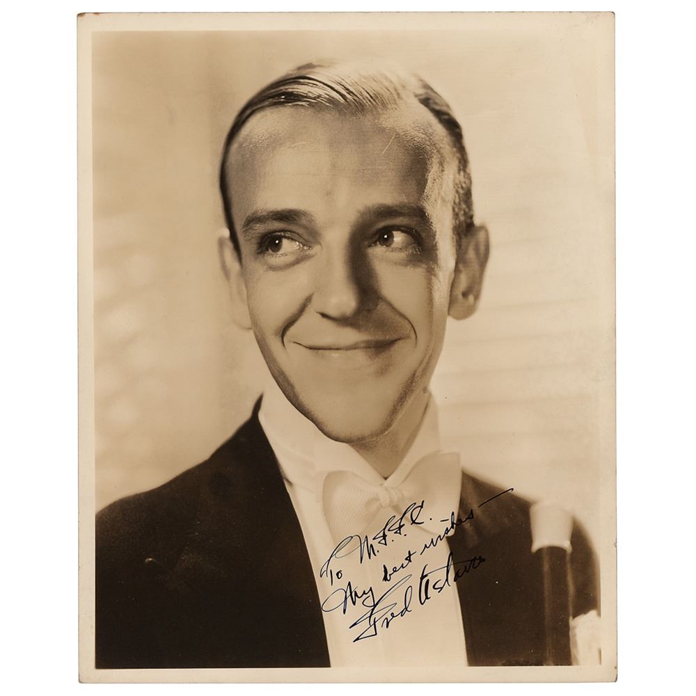 Vintage matte-finish 8 x 10 photo of a smiling Astaire in formal attire wearing a white bow tie, with the tip of his cane in the lower corner, boldly signed and inscribed in fountain pen, "To M.F.F.C., My best wishes—Fred Astaire.” In very fine condition.