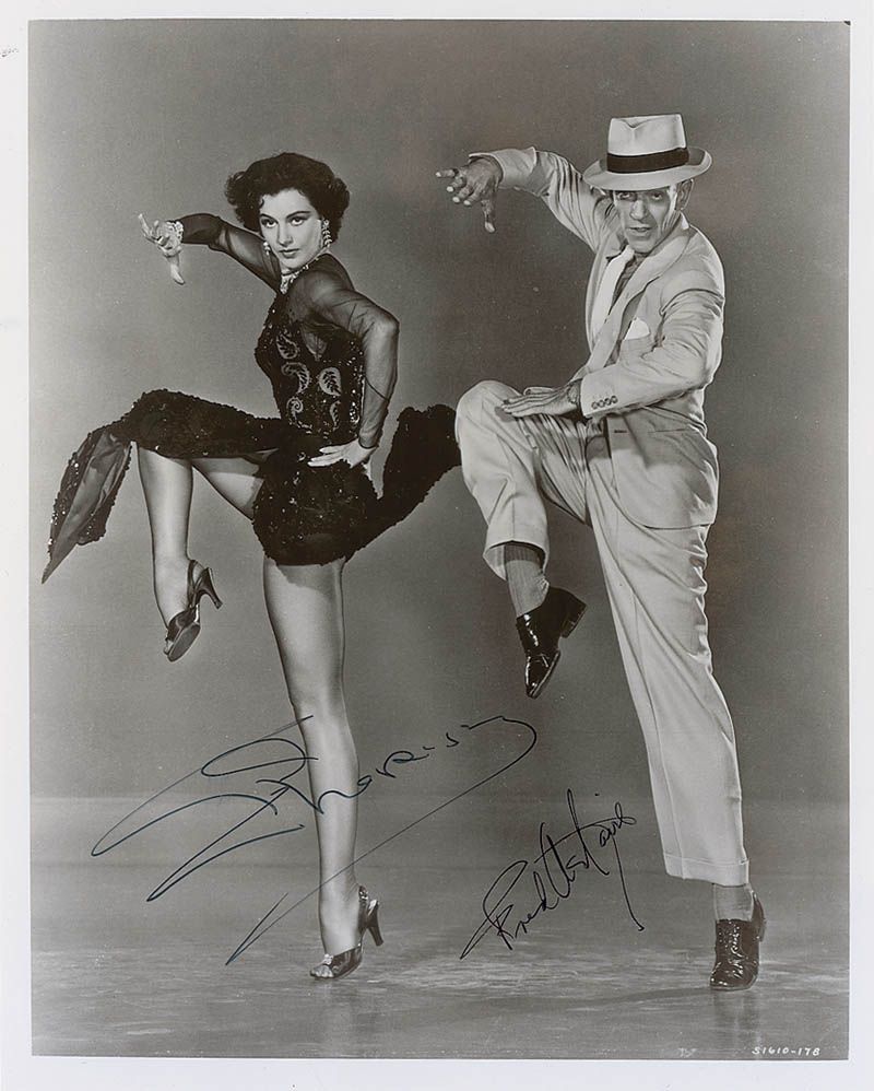 Glossy 8 x 10 photo of Astaire and Charisse in mid-step, signed in black felt tip by both. In fine condition, with a trivial brush to the beginning of Charisse’s signature.