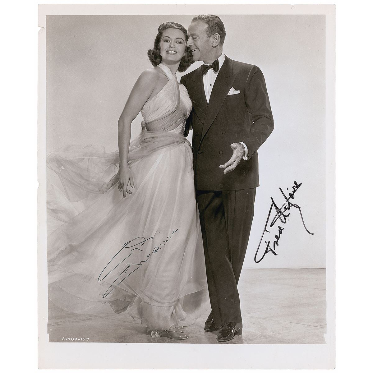 Glossy 8 x 10 full-length photo of the famed dancing pair, signed in black felt tip, “Fred Astaire,” and in black ink, “Cyd Charisse.” In fine condition, with two chips to left edge, and a diagonal crease to right side (trivially touching the bottom tip of the Astaire signature).