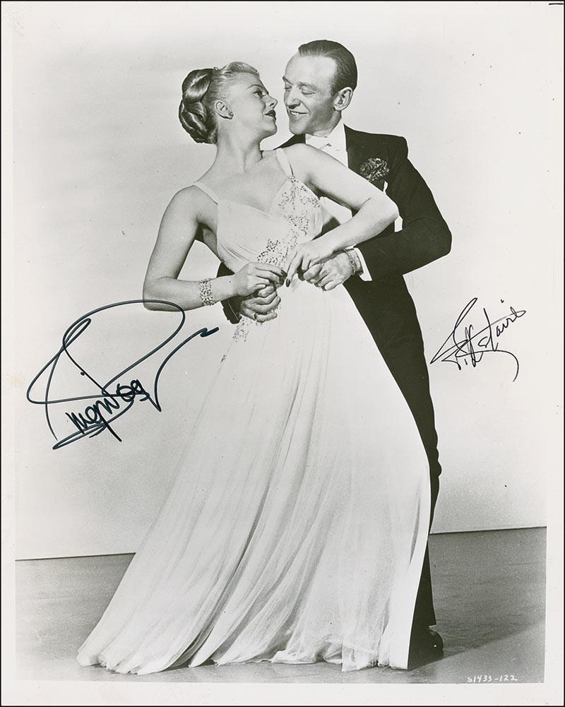 Glossy 8 x 10 photo of the couple dressed in formal attire and staring into each other’s eyes, signed in black felt tip by both Fred Astaire and Ginger Rogers. In very good condition, with scattered creases, surface marks, and impressions.