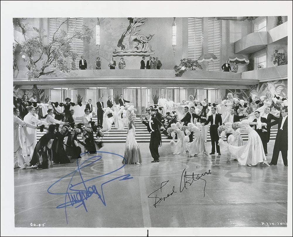 Glossy 10 x 8 photo of the couple dancing in The Gay Divorcee, signed in black ink by Fred Astaire and in blue felt tip by Ginger Rogers. In fine condition, with a few scattered light creases and surface marks.