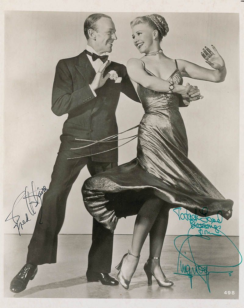 Glossy 7.75 x 10 photo of the couple in the middle of a dance routine, signed in black felt tip, “Fred Astaire,” and signed and inscribed in green felt tip “To Jack Good, Blessings from Ginger Rogers.” Scattered surface creases, impressions and spotting, and lightly trimmed left and right edges, otherwise fine condition.