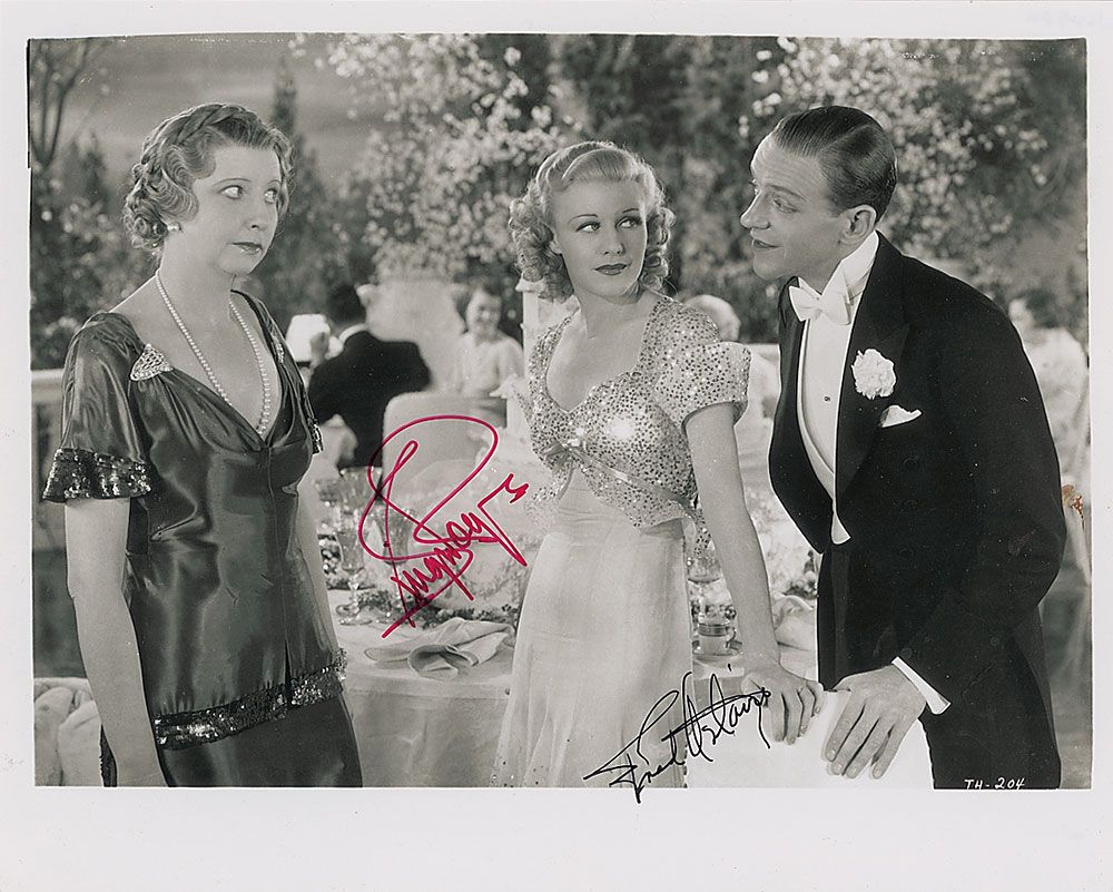 Glossy 10 x 8 photo of the dancing duo together in film scene, signed in black ink by Astaire and red felt tip by Rogers. In fine condition, with a spot of soiling to the right side.