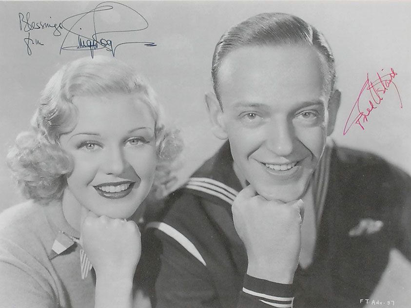 Glossy 9.25 x 7 publicity photo of the dancing duo resting their chins on their hands, signed in red ink, “Fred Astaire,” and black ink, “Blessings, from Ginger Rogers.” Nicely double-matted and framed to an overall size of 15 x 13. In fine condition, with unobtrusive surface creases.