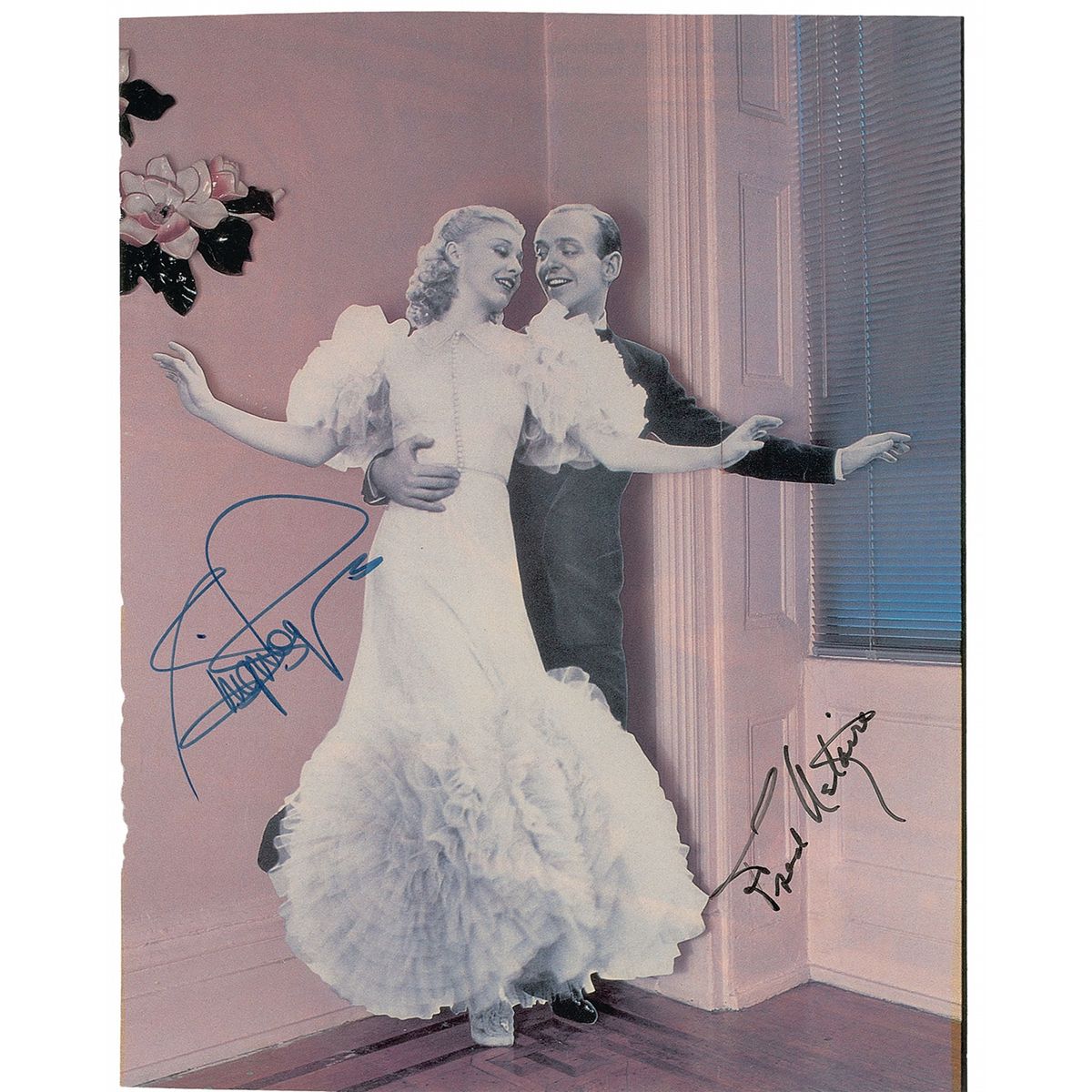 Unusual 8 x 10.25 magazine photo montage of the dancing pair, signed in black and blue felt tip by Fred Astaire and Ginger Rogers. In fine condition, with mild handling creases and trimmed edges.