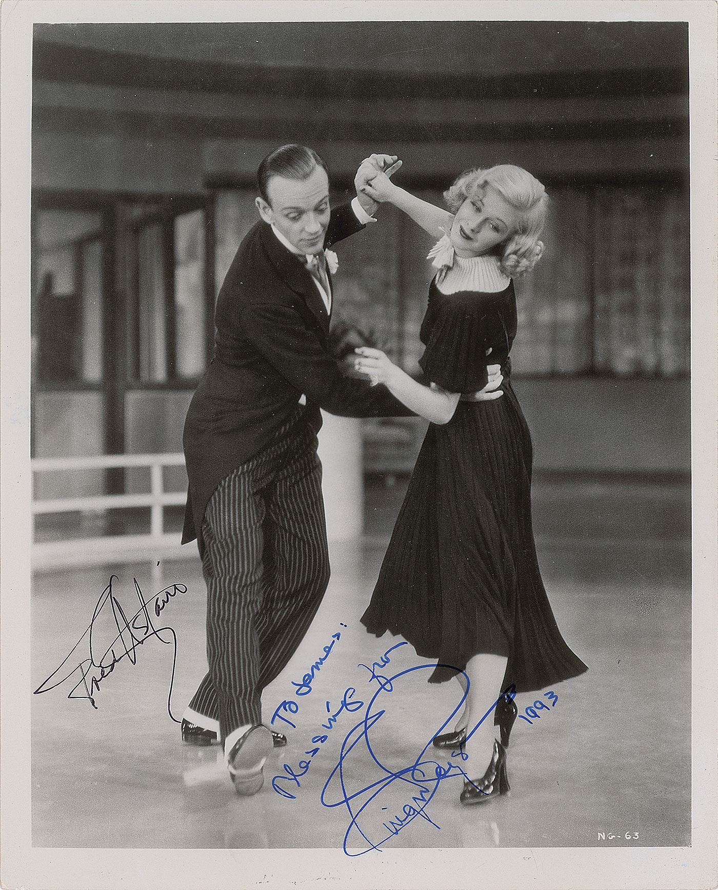 Glossy 8 x 10 publicity still showing Astaire as Lucky Garnett and Rogers as Penny Carroll in the 1936 film Swing Time, signed and inscribed in blue felt tip, "To James: Blessings from Ginger Rogers, 1993," and in black ink, "Fred Astaire.” Reverse bears a Memory Shop collection stamp and an affixed copyright caption. In fine condition, with scattered light creasing.