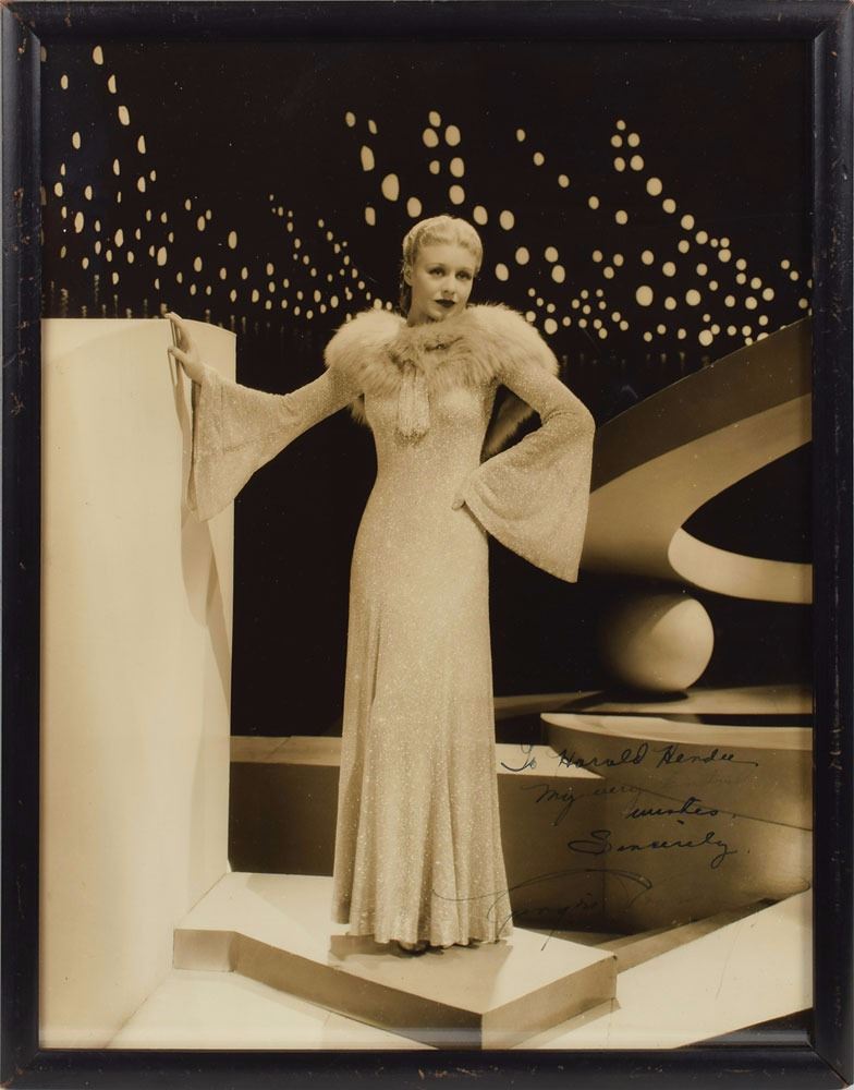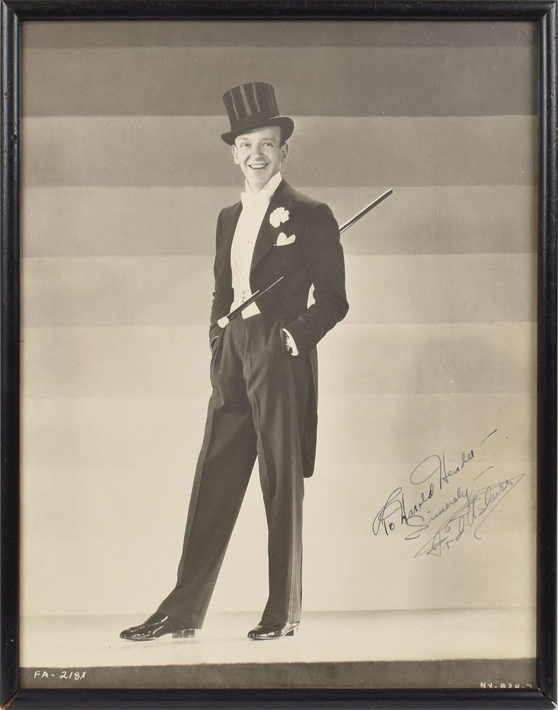 Two vintage 10 x 13 photos: a matte-finish full-length image of Astaire wearing a tuxedo and holding a cane under his arm, signed and inscribed in fountain pen, "To Harold Hendee—Sincerely—Fred Astaire"; and a glossy full-length image of Rogers posing in a lovely shimmering gown for the 1936 film Follow the Fleet, signed and inscribed in fountain pen, "To Harold Hendee, My very kindest wishes, Sincerely, Ginger Rogers." Both are individually framed to slightly larger sizes. In overall fine condition, with Rogers' last name very light, but legible. Both of these photographs were inscribed to Harold Hendee during the 1930s when all three worked at RKO Pictures. Accompanied by an unsigned photo of Hendee, who was head of research for the studio.