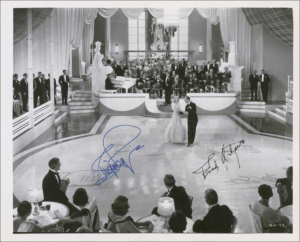 Glossy 10 x 8 photo from one of their early films of the couple dancing in a grand ballroom, signed in black felt tip by Fred Astaire and in blue felt tip by Ginger Rogers. In fine condition, with some light edge dings and corner tip creases.