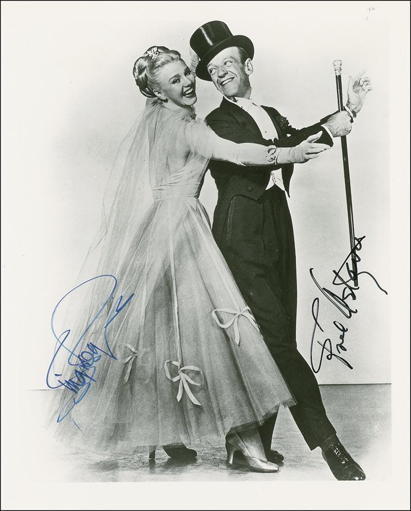 Wonderful glossy 8 x 10 photo of the snazzily-dressed couple, signed in black felt tip by Fred Astaire and in blue felt tip by Ginger Rogers. In very fine condition.