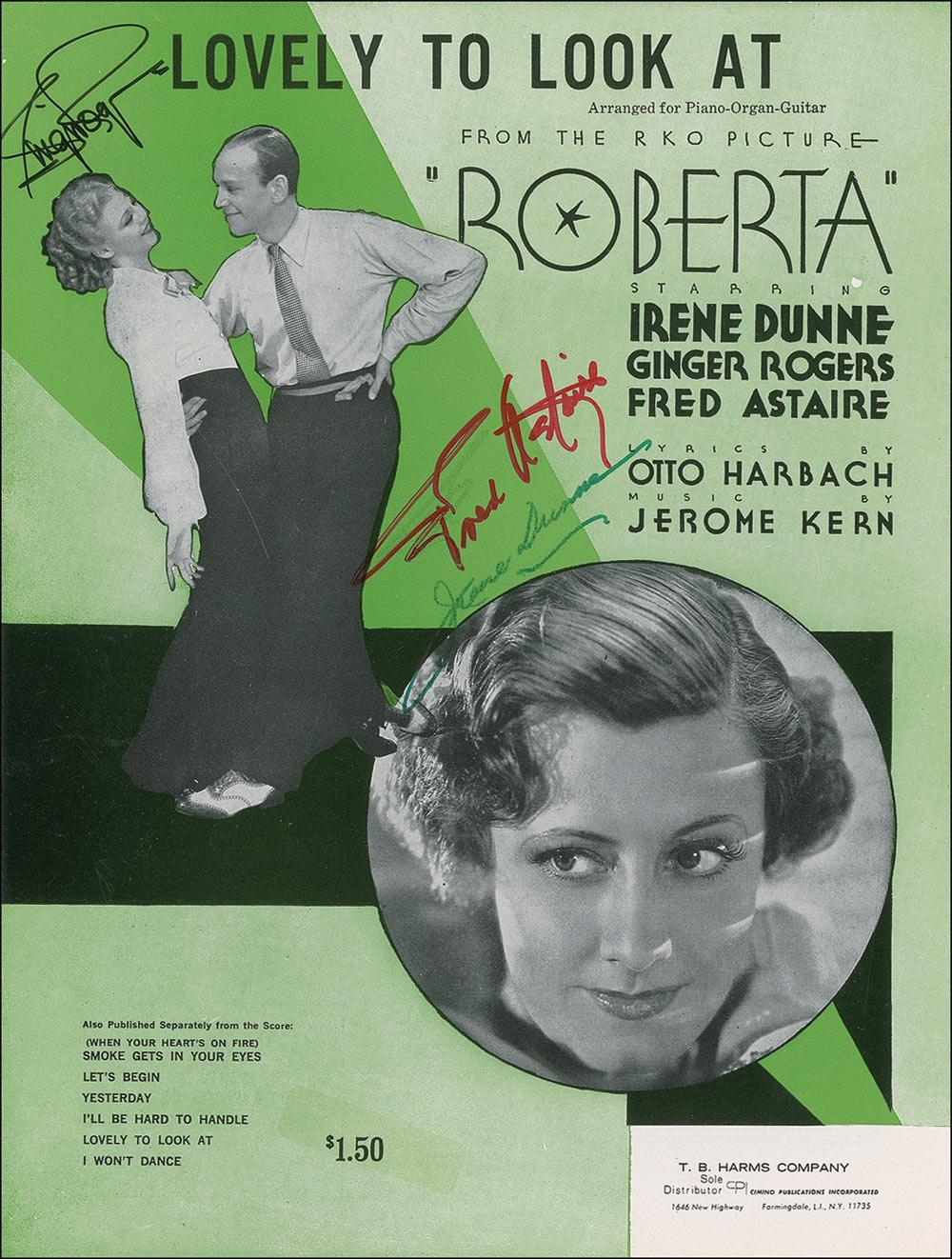 Sheet music for the song ‘Lovely to Look At’ from the RKO film Roberta, 9 x 12, four pages, signed in red felt tip by Fred Astaire, black felt tip by Ginger Rogers, and green felt tip by Irene Dunne. In fine condition, with a few scattered surface impressions, a small strip of clear tape residue across the original price, and very faint ink shadow near Astaire’s name from a first attempt to sign.