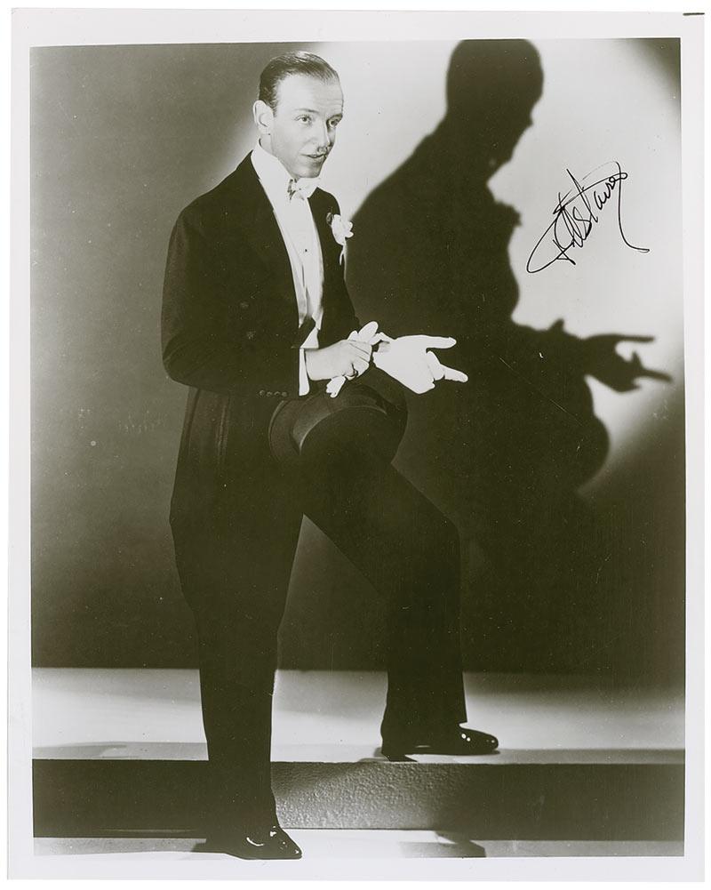 Glossy 8.25 x 10 photo of Astaire in tails holding his top hat, signed in black ink “Fred Astaire.” In fine condition.