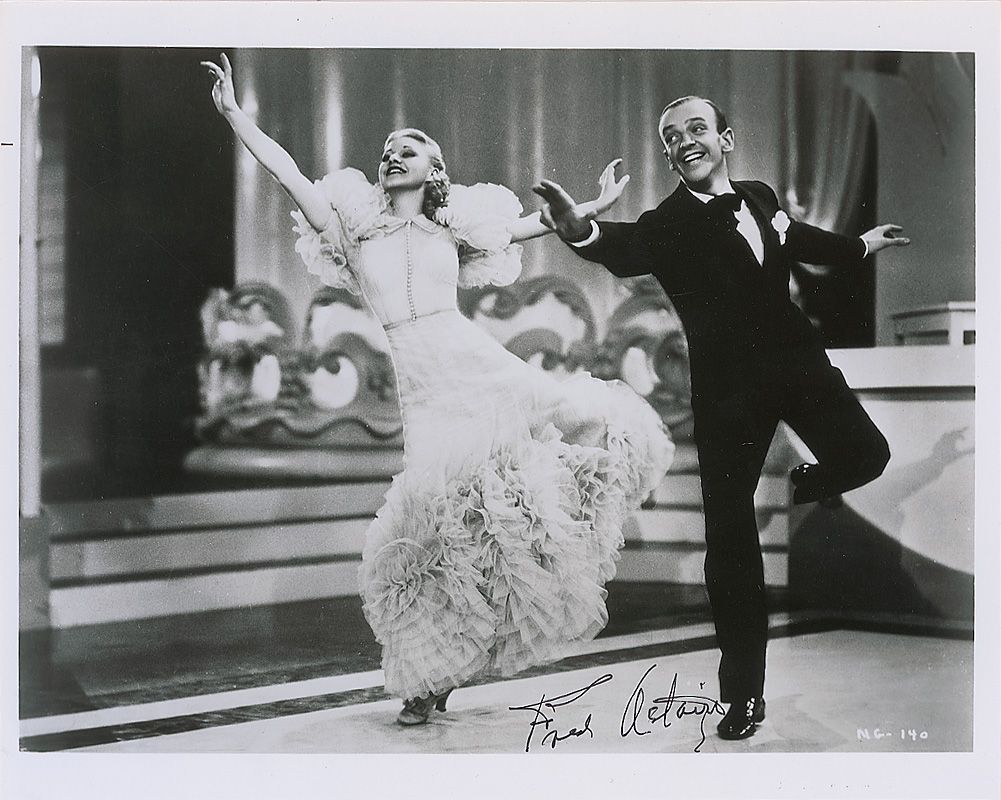 Energetic glossy 10 x 8 photo of Astaire dancing alongside Ginger Rogers, signed in black felt tip by Astaire. In fine condition.