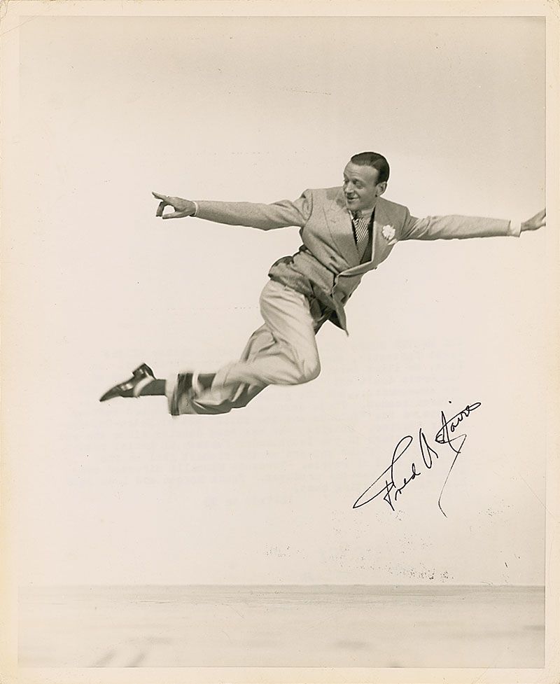 Glossy 8 x 10 photo of Astaire leaping into the air while filming Yolanda and the Thief, signed in black ink. Some creasing to corners, otherwise fine condition.