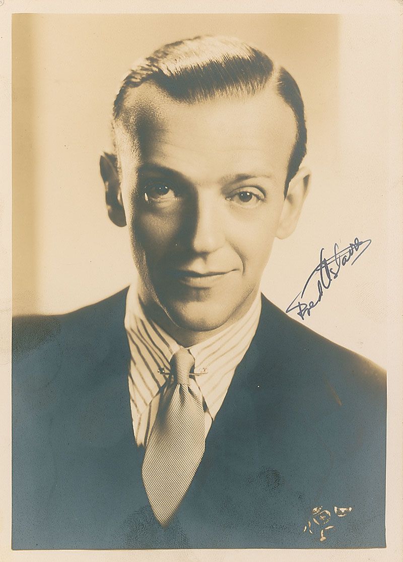 Vintage matte-finish 5 x 7 bust portrait of Astaire in a dashing suit and tie, attractively signed in fountain pen against the clean white background. In fine condition, with trivial creases to upper corner tips and slight silvering to dark areas of the image. Accompanied by the original mailing envelope, bearing a 1943 Beverly Hills postmark.