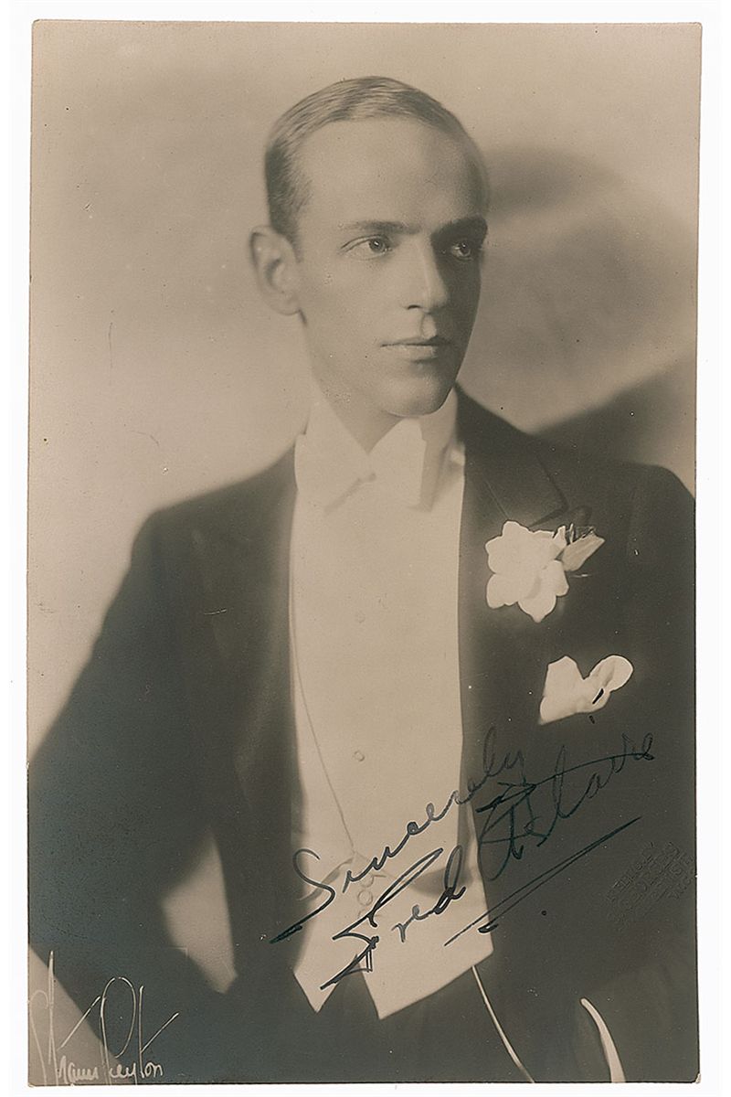 Handsome vintage matte-finish 3.25 x 5.25 photo of the young Astaire in dashing attire, signed in fountain pen, “Sincerely, Fred Astaire.” A pencil collector’s notation to the reverse indicates that it was signed on December 19, 1930, at the Ziegfeld Theatre, where Astaire was starring in Smiles. In fine condition.