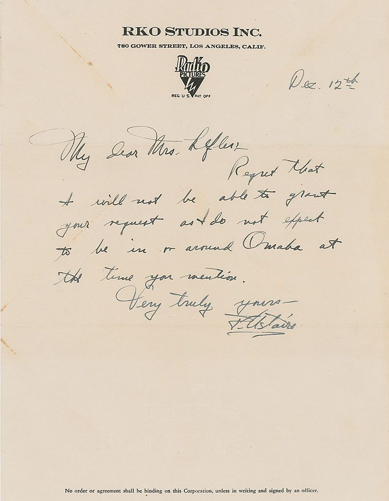 Early ALS signed “F. Astaire,” one page, 8.5 x 11, RKO Studios letterhead, December 12, [1934]. Response to an invitation. In full: “Regret that I will not be able to grant your request as I do not expect to be in or around Omaha at the time you mention.” In fine condition, with a few slight stains. Accompanied by the original mailing envelope. Astaire had just made the transition from stage to screen, having appeared in just two films at the time he wrote this letter.
