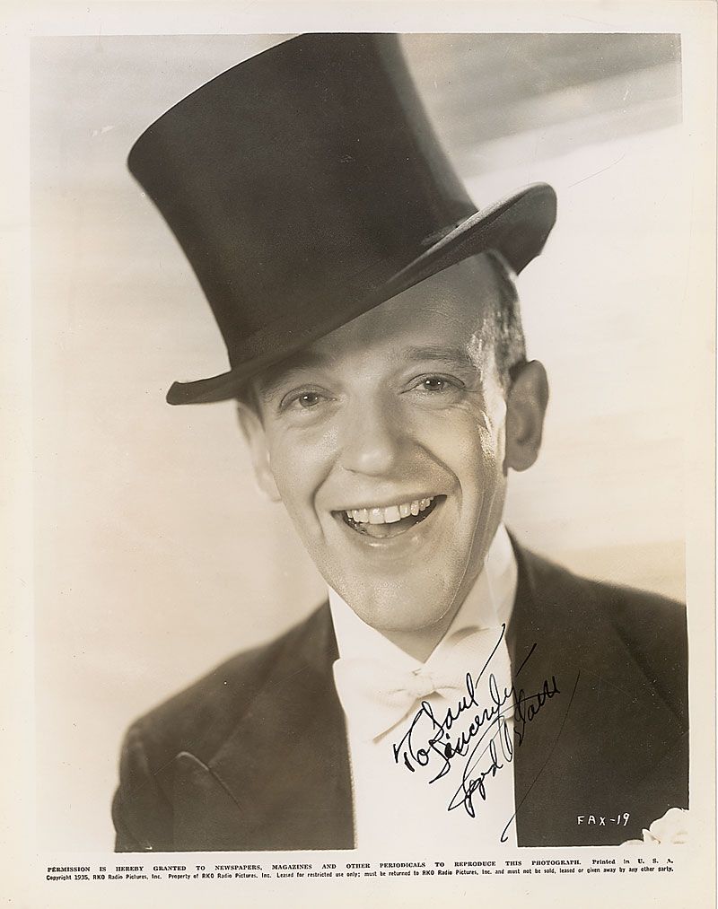 Vintage glossy 8 x 10 RKO publicity photo of Astaire in a tilted top hat, signed and inscribed in fountain pen, “To Saul—Sincerely—Fred Astaire.” Reverse is stamp-dated August 17, 1935. In fine condition, with light scattered surface marks.