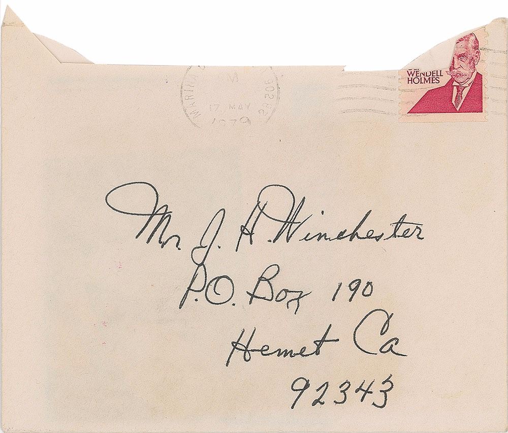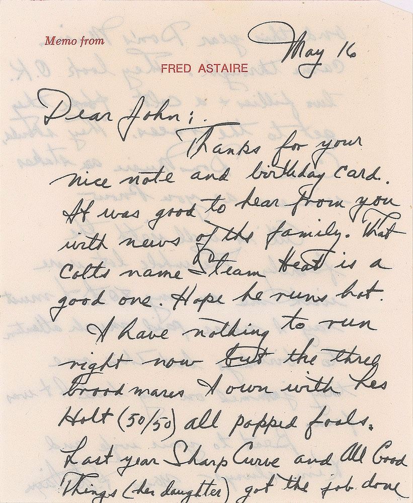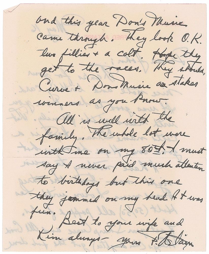 ALS signed “F. Astaire,” one page both sides, 4.5 x 5.5, personal letterhead, May 16, 1979. Letter to John Winchester, in part: "Thanks for your nice note and birthday card. It was good to hear from you with news of the family. That Colt's name Steam Heat is a good one. Hope he runs hot. I have nothing to run right now but the three brood mares I own with Les Holt (50/50) all popped foals. Last year Sharp Curve and All Good Things (her daughter) got the job done and this year Don's Music came through. They look O.K. two fillies & a colt. Hope they get to the races. They should, Curve & Don's Music are stakes winners as you know." In fine condition. Accompanied by the original mailing envelope (missing the flap).