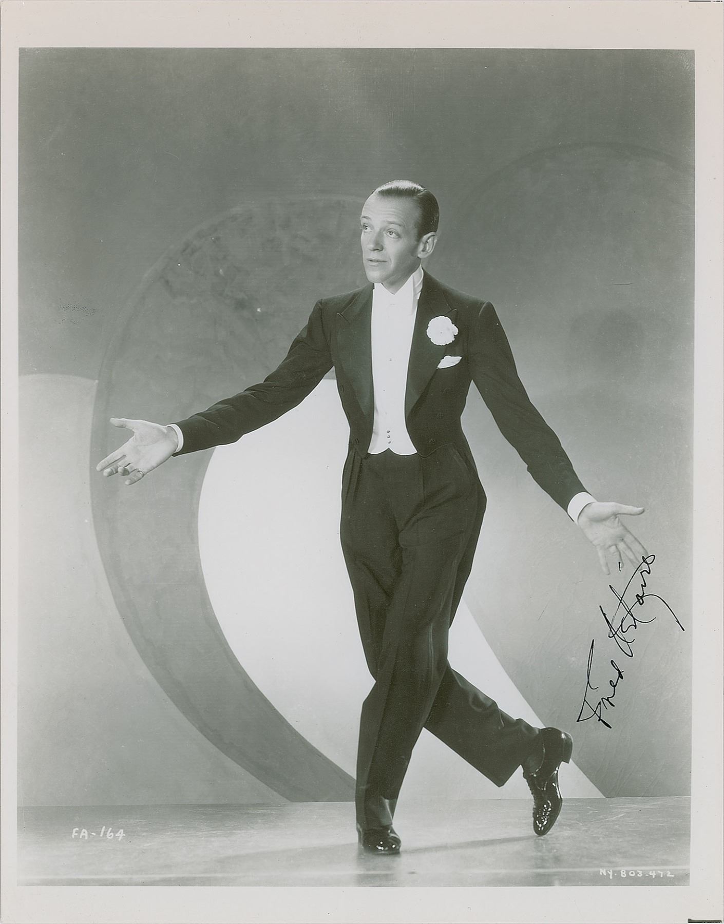 Glossy 8 x 10.25 full-length photo of Fred Astaire dancing in a tuxedo, signed in black ink. In very good to fine condition, with a few light surface creases (one touching Astaire's right eye), and a horizontal crease in the top border.