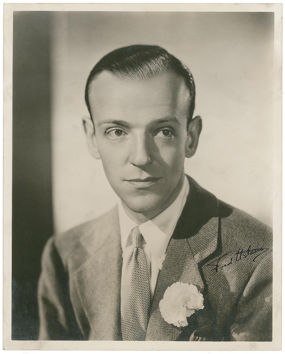 Handsome vintage matte-finish 8 x 10 photo of a young Astaire looking dapper in a tie and boutineer, signed in fountain pen. In fine condition, with a light crease to top left corner, and some scattered light toning and soiling to borders.