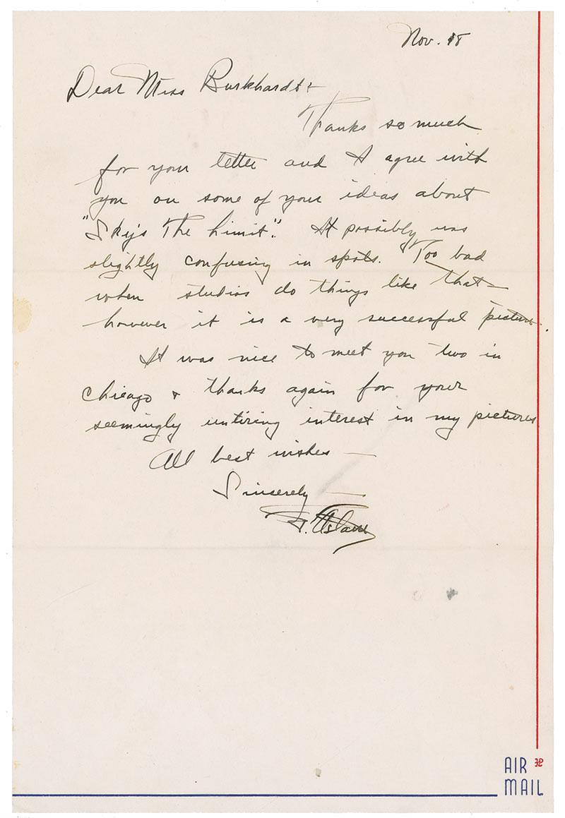 ALS signed “F. Astaire,” one onionskin page, 7.25 x 10.75, November 18. Astaire writes a fan. In part: “I agree with you on some of your ideas about ‘Sky’s the Limit.’ It possibly was slightly confusing in spots. Too bad when studios do things like that—however it is a very successful picture.” In fine condition. Accompanied by the original mailing envelope addressed by Astaire and postmarked November 19, 1943.