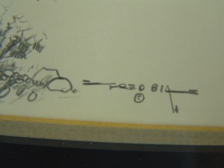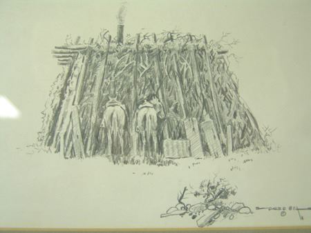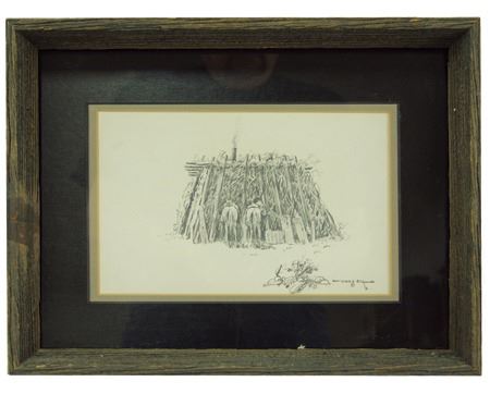 Ca. 1981, Signed original pencil sketch showing two horses tied up to a Navajo structure made of sticks and logs. Very good condition. Double matted under glass and with barnwood frame. 6" x 9-1/2" (10-1/2" x 14" framed)