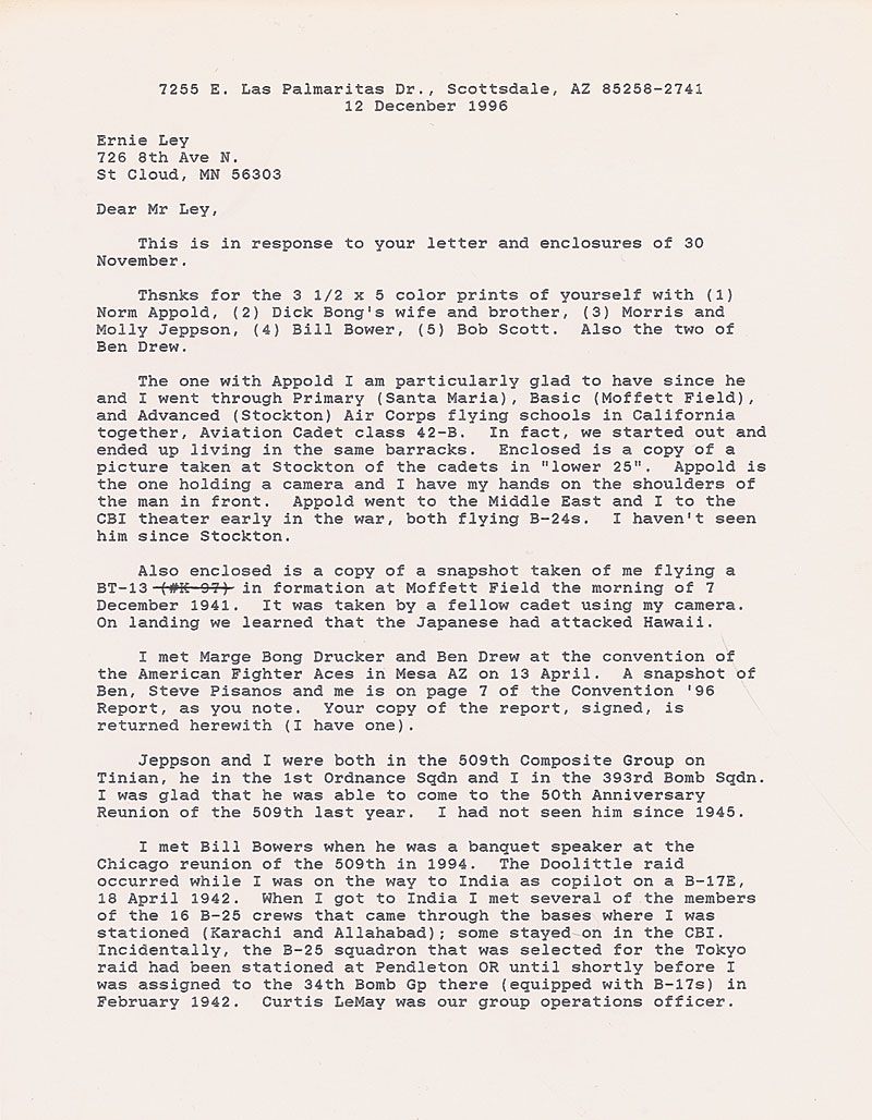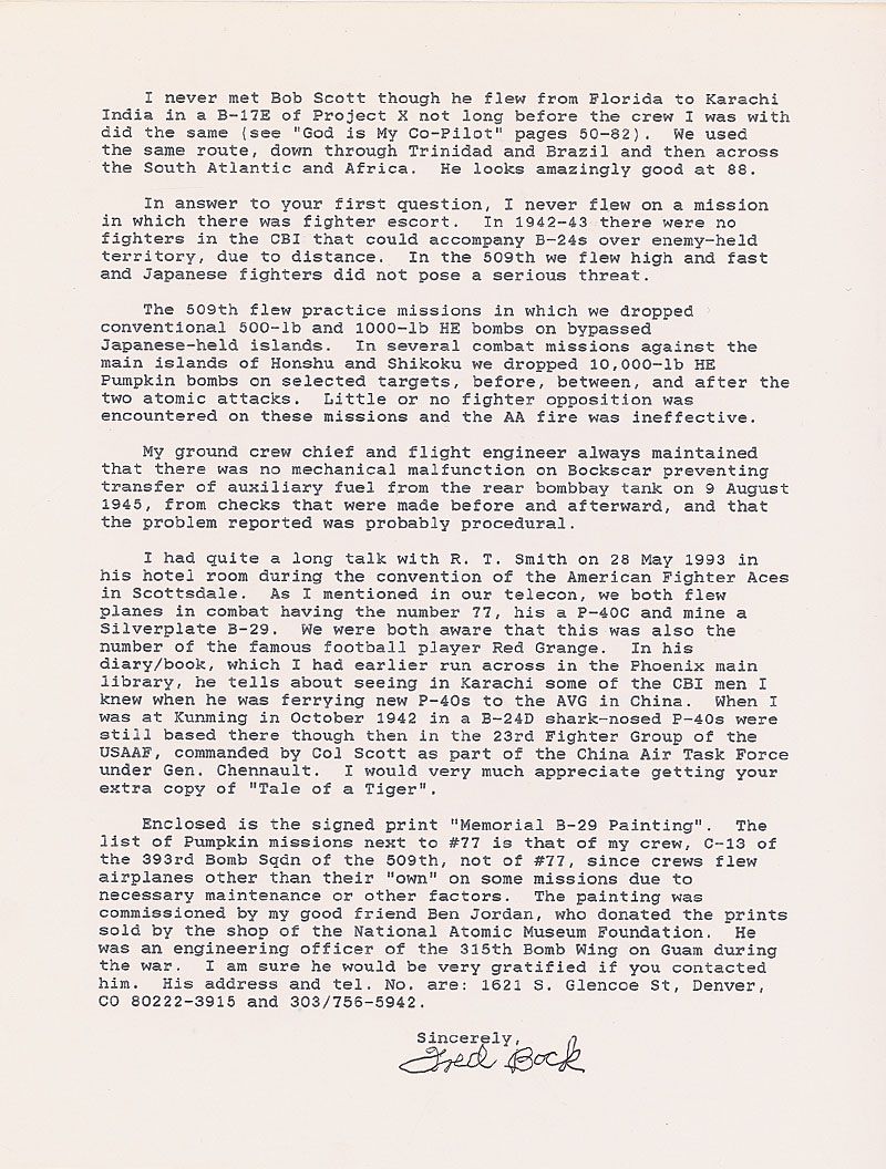 TLS, two pages, 8.5 x 11, December 12, 1996. Letter to an admirer. In part: “Jeppson and I were both in the 509th Composite Group on Tinian…I never flew on a mission in which there was a fighter escort. In 1942–43 there were no fighters in the CBI that could accompany B-24s over enemy-held territory…The 509th flew practice missions in which we dropped conventional 500-lb and 1000-lb HE bombs on bypassed Japanese-held islands. In several combat missions against the main islands of Hinshu and Shikoku we dropped 10,000-lb HE Pumpkin bombs on selected targets, before, between, and after the two atomic attacks. Little or no fighter opposition was encountered on these missions and the AA fire was ineffective.” In very fine condition.
