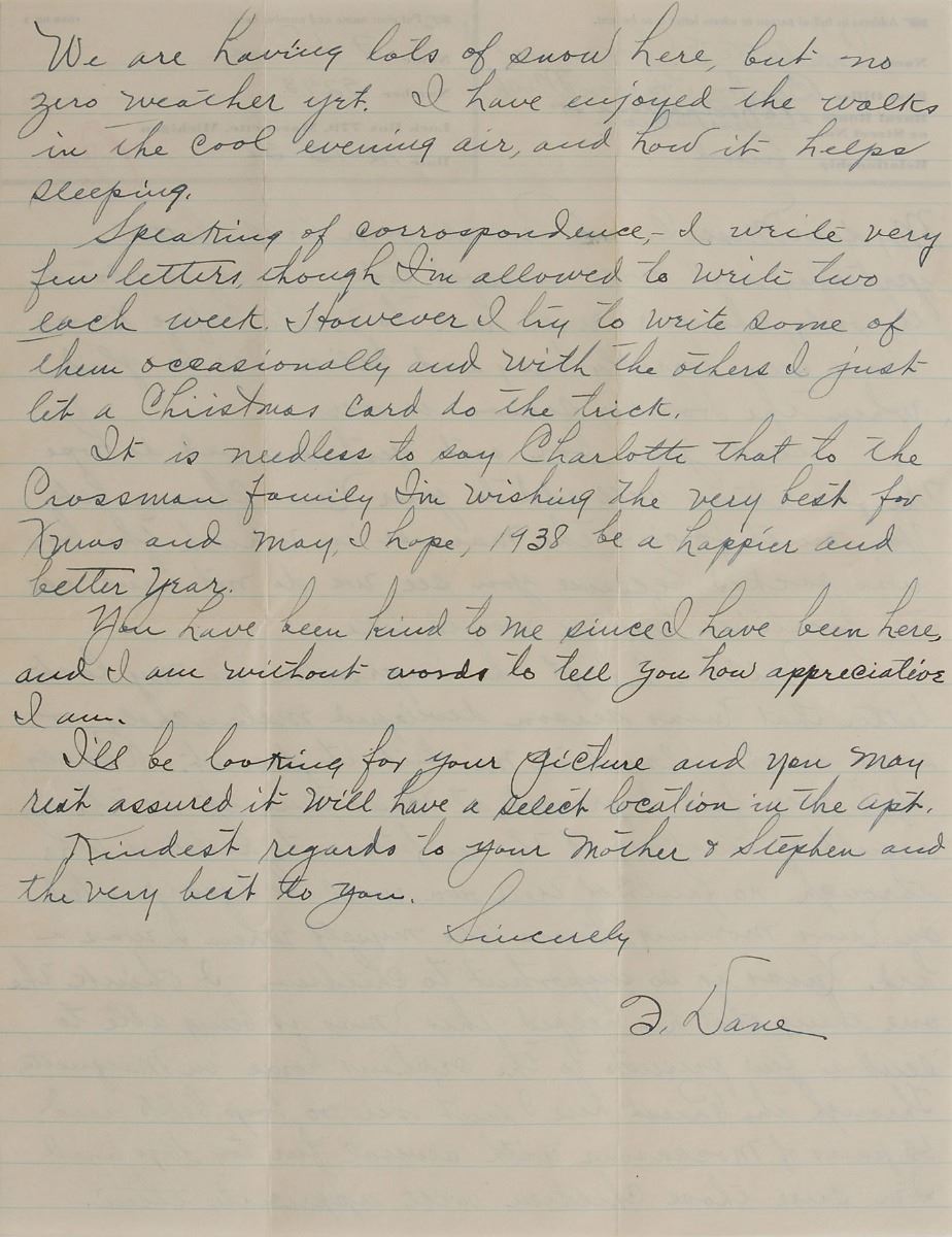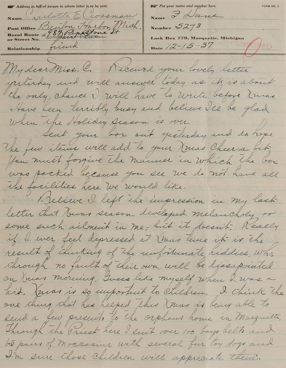 Midwestern armed robber and contract killer during the Prohibition era (1893–1940) who is considered a prime suspect in the infamous St. Valentine's Day Massacre of 1929. ALS signed with his alias, “F. Dane,” one lightly lined page, both sides, 8.5 x 11, December 15, 1937. Written from Marquette State Prison, a letter to Charlotte Crossman, in full: “Believe I left the impression in my last letter that Xmas season developed melancholy or some such ailment in me; but it doesn’t. Really if I ever feel depressed at Xmas time it is the result of thinking of the unfortunate kiddies, who, through no fault of their own, will be disappointed on Xmas morning. Guess like myself when I was a kid. Xmas is so important to children. I think the one thing that has helped this Xmas is being able to send a few presents to the orphans home in Marquette. Through the Priest here I sent over 100 boys belts and 65 pairs of moccasins with several fur toy dogs and I’m sure those children will appreciate them.” In fine condition. The first time we have offered Burke in any format.
