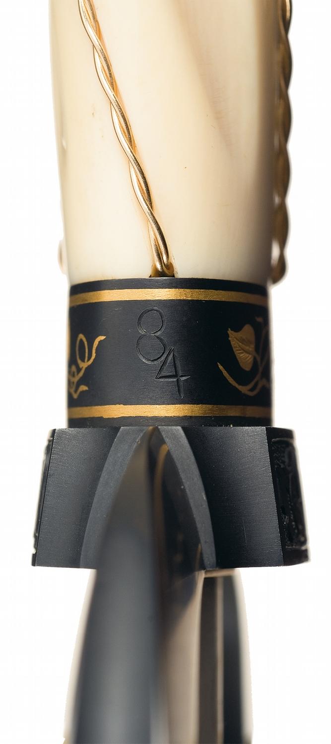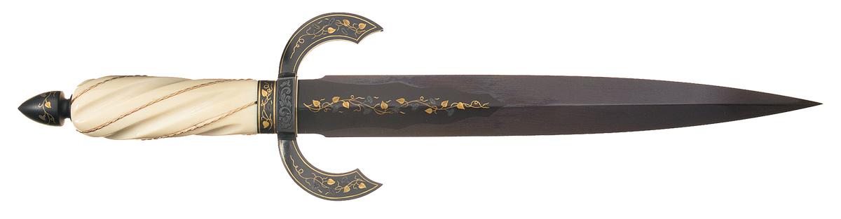 This dagger was handcrafted by Fred Carter in 1984. Over the past 25 plus years, Fred Carter has established himself as one the industry's most renowned knifemakers of his generation, and is the solo author of his work, including engraving and gold inlay. He has held two terms as President of the Knifemaker's Guild, is a two-time recipient of the prestigious W.W. Cronk award and winner of the Beretta award for "Excellence in Craftsmanship." This Carter dagger features a 9 5/8 inch polished blue finished blade with a 3 3/4 inch long matte blued section featuring a silver and gold inlaid vine pattern. Matte blue finished fittings. The turned down guard has a grooved outer edge, a scroll engraving on a punch dot background, and the silver and gold inlaid vine pattern with gold border, which extends to the spacer between the handle and guard. The spacer is also signed with Fred Carter's initials ("FC") and dated "84". The acorn shaped pommel also features the silver and gold inlaid vine motif. The fluted ivory handle is adorned with twisted gold wire. OAL: 14 3/4"