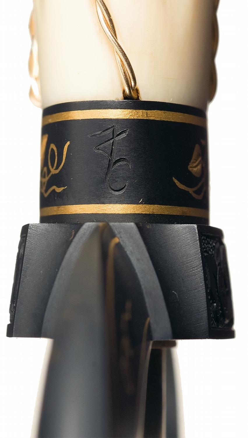 Condition: Excellent, with most of the polished and matte blue finishes remaining with limited light spotting on the guard and blade. The polished blue finish has taken on a purple hue. The ivory has a few mild handling marks, with a nice grain pattern.