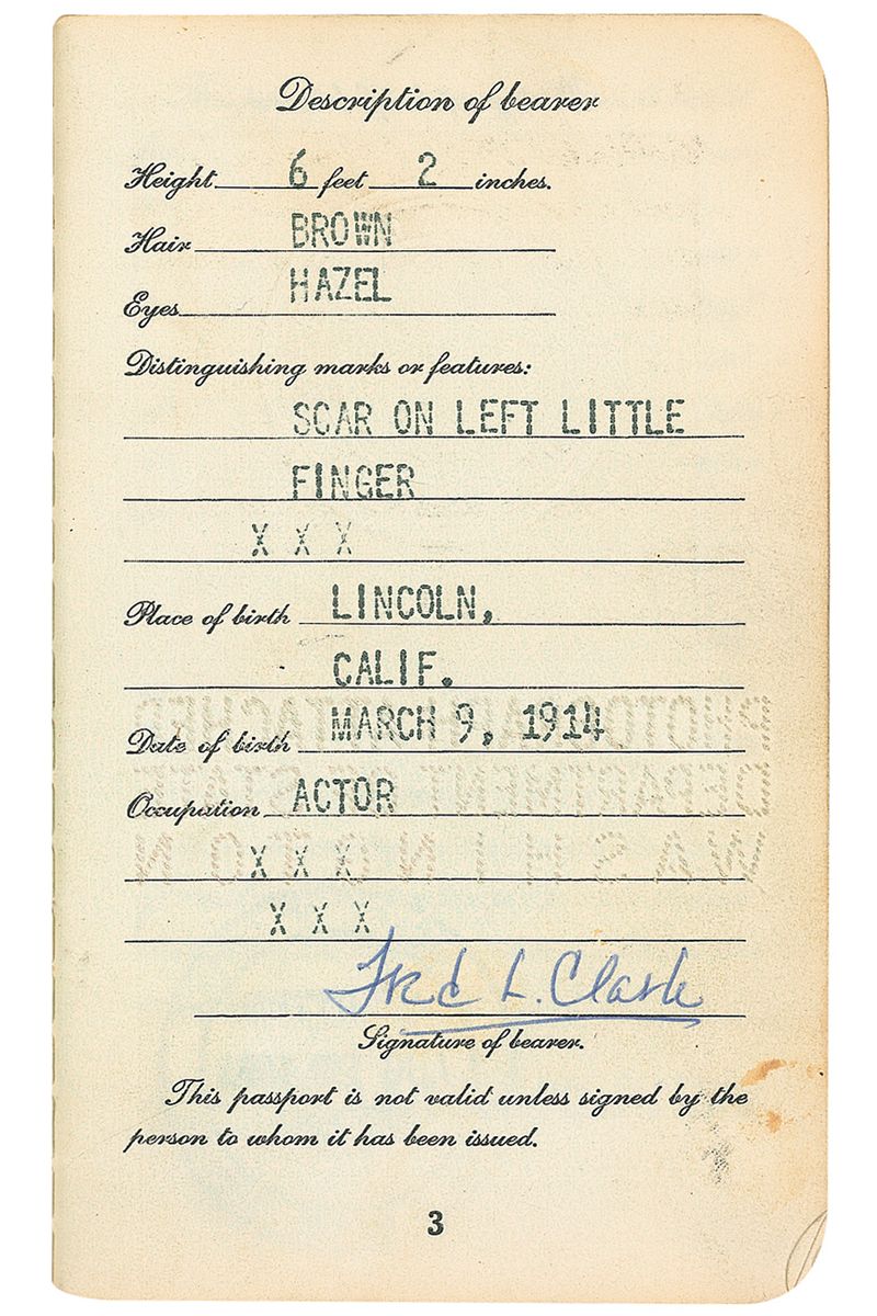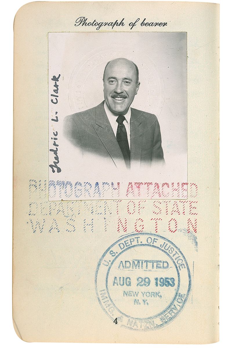 Actor (1914–1968) who enjoyed a 20-year film career including Sunset Boulevard, How to Marry a Millionaire, and Auntie Mame. Clark’s personal passport, number 130307, issued on May 22, 1953. Passport measures 3.75 x 6, and contains his printed personal information on the third page, signed at the bottom “Fred L. Clark.” Affixed on the reverse of the personal information page is Clark’s 2.5 x 3 passport snapshot, signed vertically along the left edge, “Fredric L. Clark.” Photo bears an embossed State Department seal over top portion. A smallpox vaccination form is stapled to the inside back cover, also signed by Clark. In fine condition, with expected handling wear and stamps.