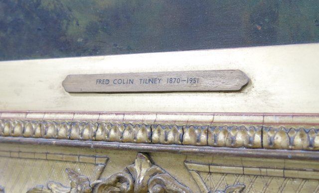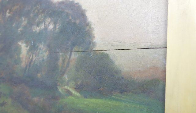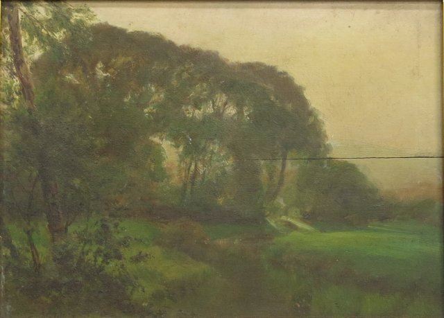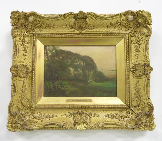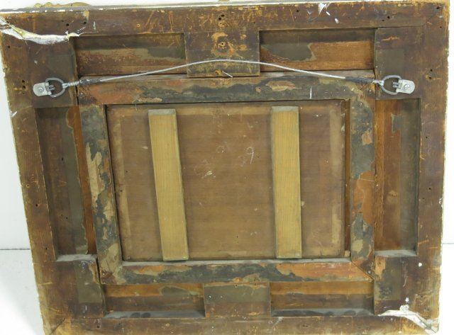 Signed lower left, Oil on panel. Framed. Elaborate gilded framed. Approx. 11" x 8.25" unframed, 22" x 18" framed. Cracks in panel.