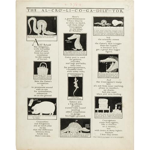 <B>Frederick G. Cooper - "The Al-Cro-Li-Co-Ga-Dile-Tor" Illustration Original Art (undated).</B></I> Fred Cooper, famed for his splendid typography and illustration, created this jaw-dropping masterpiece of pure design. The lettering and illustrations on this whimsical piece are hand drawn and composed to perfection. Fred Cooper is celebrated for his invention of the distinctive typeface, "the Cooper lowercase alphabet," and his work appeared on the covers of such magazines as <B>Life</B></I> and <B>Colliers</B></I>, and he also drew countless black and white decorations for <B>Life</B></I> editorials. This piece has an overall size of 11.5" x 14.75", and the art is in Excellent condition.<BR><BR><b>Shipping:</b> Flat Material, Small (<a target="_blank" href="http://www.heritageauctions.com/common/shipping.php">view shipping information</a>)