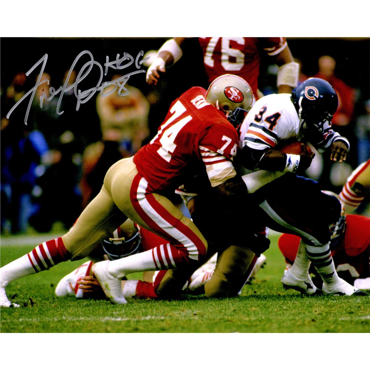 Fred Dean signed San Francisco 49ers action tackling Walter Payton 8x10 photo with 'HOF 08' inscription. Item comes with a Schwartz Sports Memorabilia tamper-proof numbered hologram and Certificate of Authenticity which can be verified online.