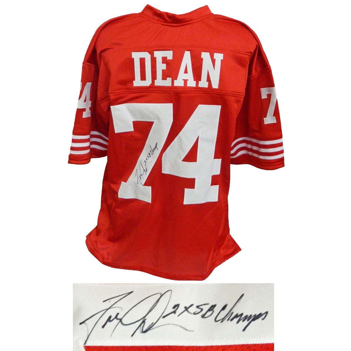 Fred Dean signed red throwback custom football jersey with '2x SB Champs' inscription. Item comes with a Schwartz Sports Memorabilia tamper-proof numbered hologram and Certificate of Authenticity which can be verified online.