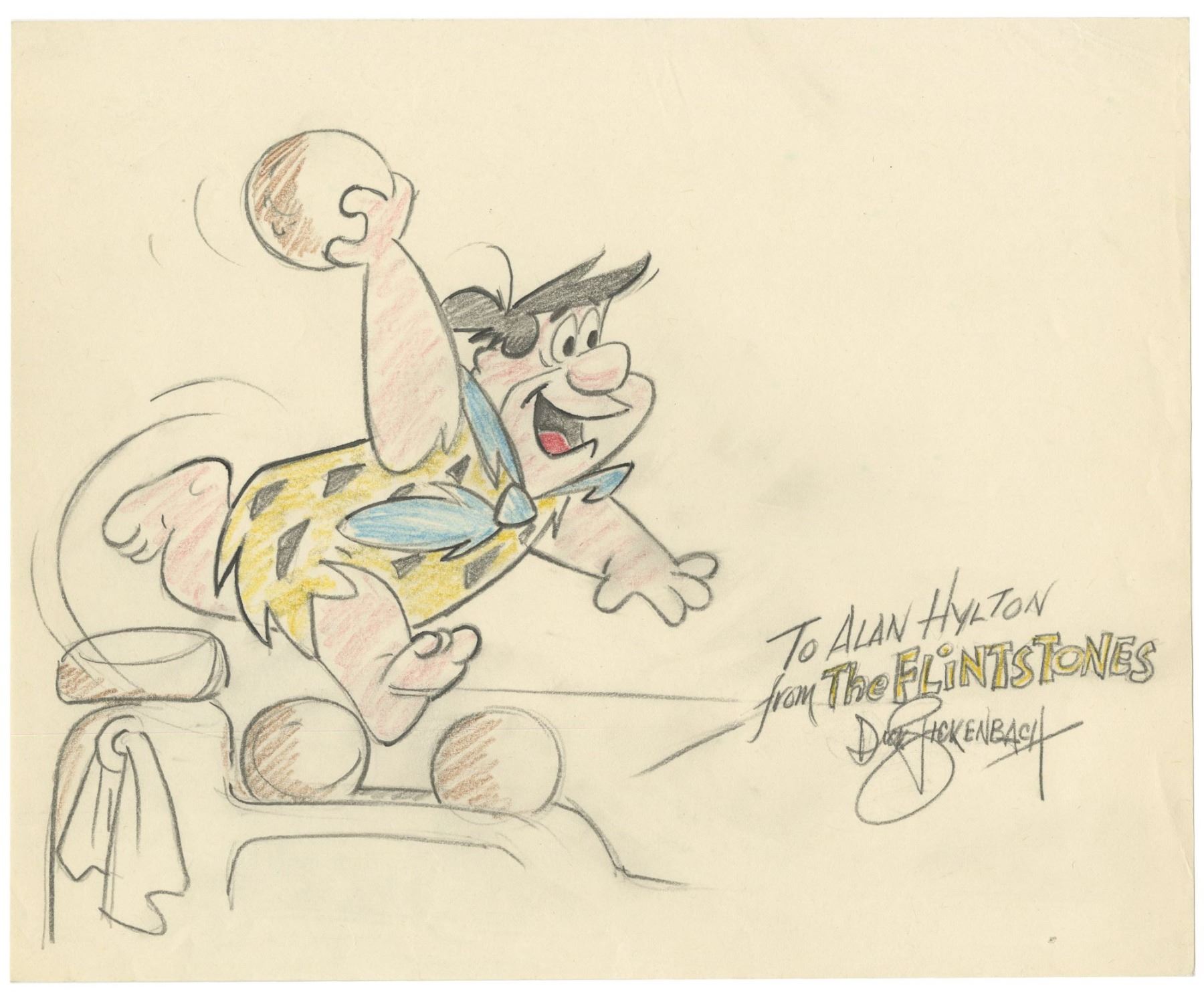 (Hanna Barbera, c.1980) An original drawing of Fred Flintstone from the animated series, "The Flintstones". This drawing was created by Dick Bickenbach in colored pencil on thin artist paper and is signed by Bickenbach in the lower-right corner. Bickenbach was a longtime animator and artist for Warner Bros, Iwerks, and Hanna Barbera studios, and is well known for his contributions to "The Flintstones" cartoon series as well as the line of comic books. The drawing is a wonderful image of Fred bowling and is personalized in the lower right "To Alan Hylton from The Flintstones". Measuring 8.5"x10.5", the drawing is in very good condition with little wear.