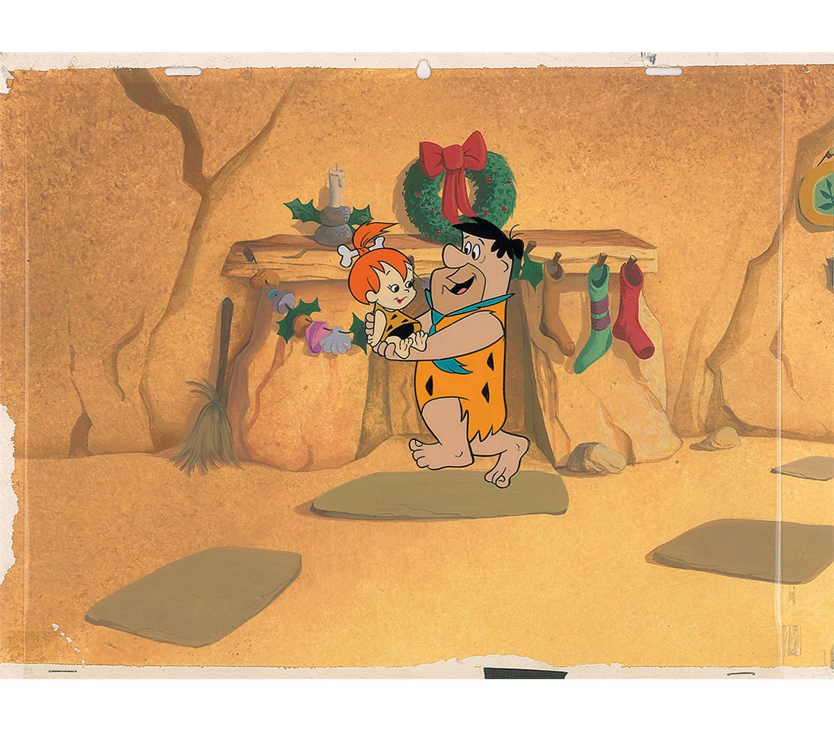 (Hanna-Barbera Studios, circa 1965) Original production cel and production background featuring Fred and Pebbles from The Flintstones, showing them in a Christmastime setting. The cel is placed on a hand-painted production background. Image measures 3 x 4.25, with overall dimensions of 14 x 11. Small strips of surface loss to edges of the background and a couple trivial tears to top edge, otherwise fine condition.